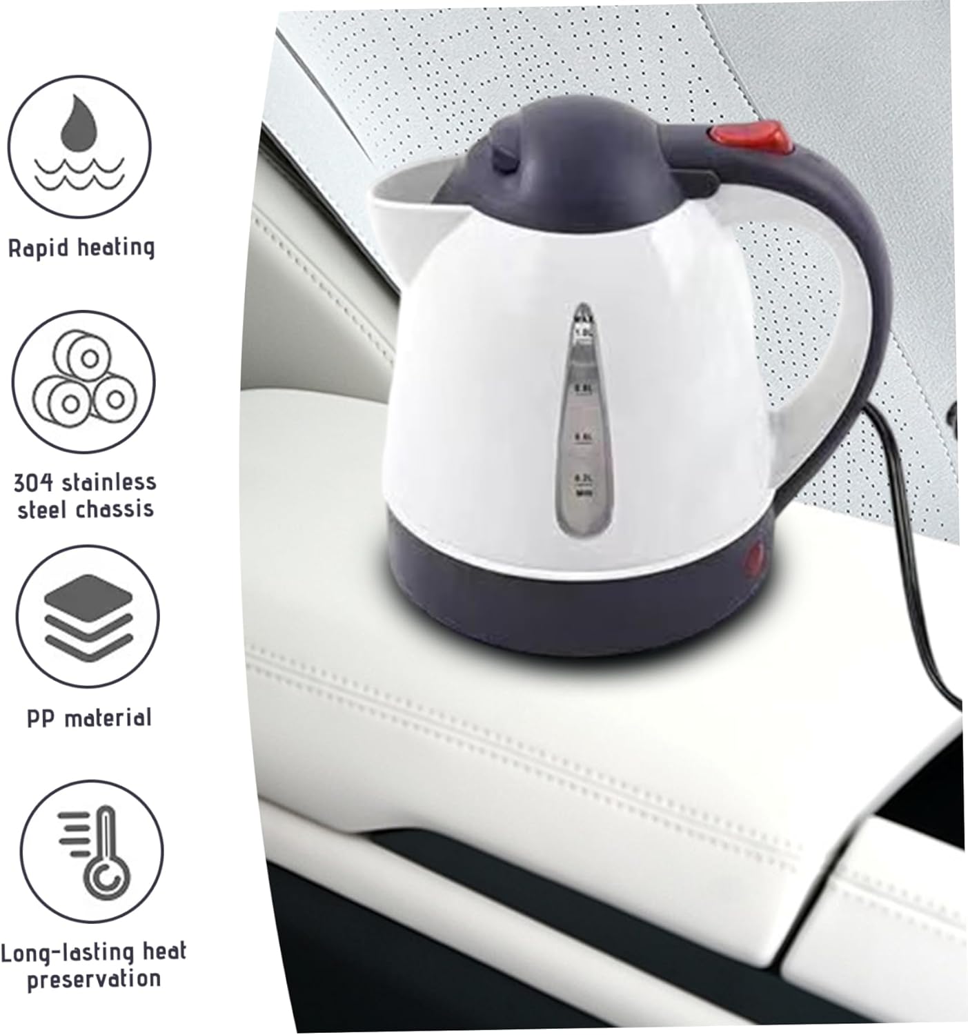 Description: This 1000ml electric water heater is the ideal companion for travelers, campers, and everyday users who need hot water fast. Compact yet powerful, the kettle boasts a stainless steel heating plate for quick and efficient boiling. The food-grade PP material exterior is heat-resistant, safe to touch, and long-lasting durability, making it suitable for both car use and home use. The integrated water level scale allows for precise measuring, so you can boil just the amount you need. Whether you're brewing a fresh cup of tea, preparing instant noodles, or warming water for a baby bottle, this kettle delivers hot water in just a few minutes. It features a secure lid and a well-designed spout to prevent spills during pouring. Thanks to its insulated construction, the kettle retains heat even after unplugging, acting like a insulated bottle for added convenience. Lightweight and portable, it's easy to pack and ideal for road trips, camping, or small-space living. Features:. -Color: White. -Material: PP, Stainless Steel. -Size: 18.5x16.5 cm/7.28x6.50 inch. -Voltage: 24V. -Capacity: 1000ml. Note:Manual measurement, please allow slight errors on size.The colors may exist slight difference due to different screens. Package Including 1 * Electric Water Heater