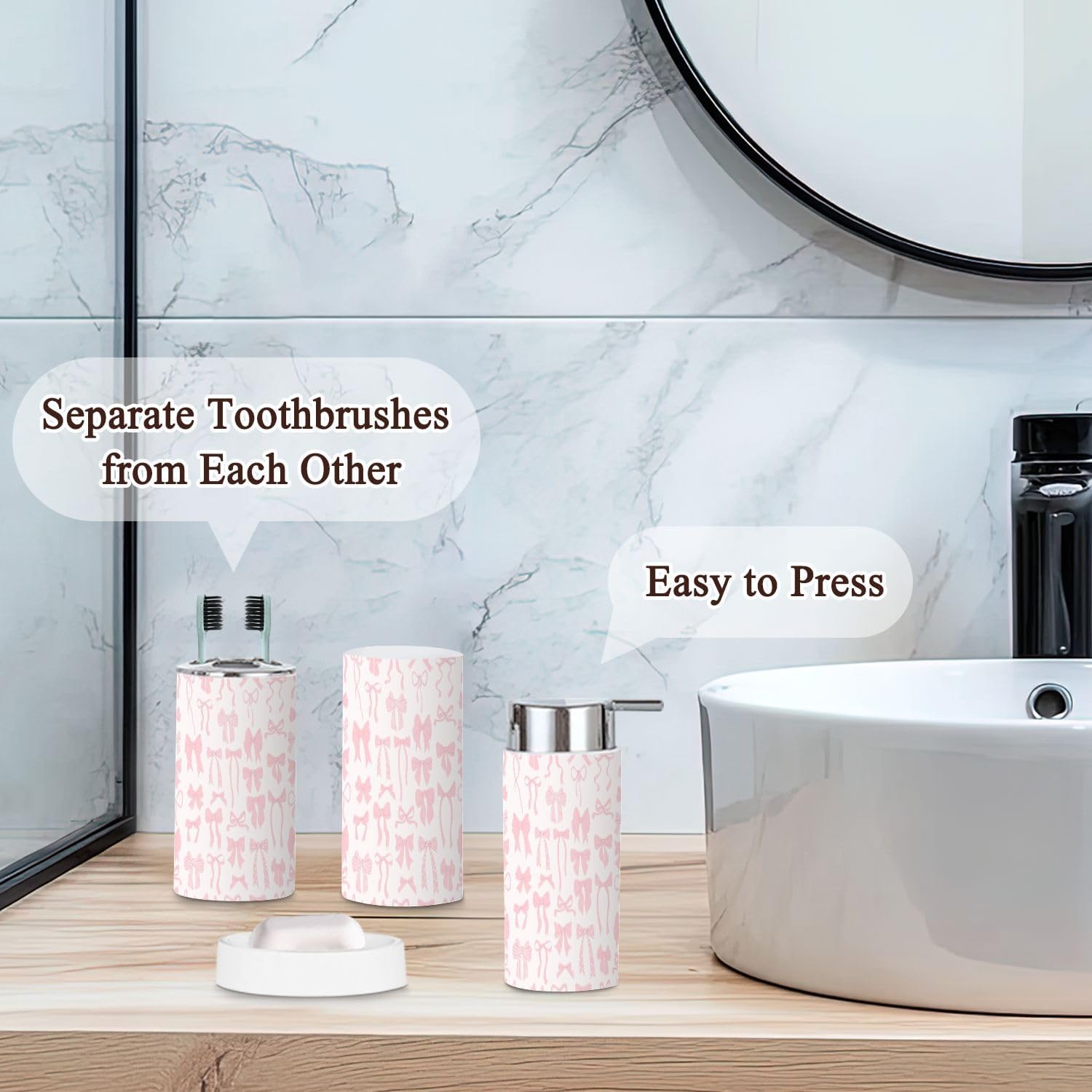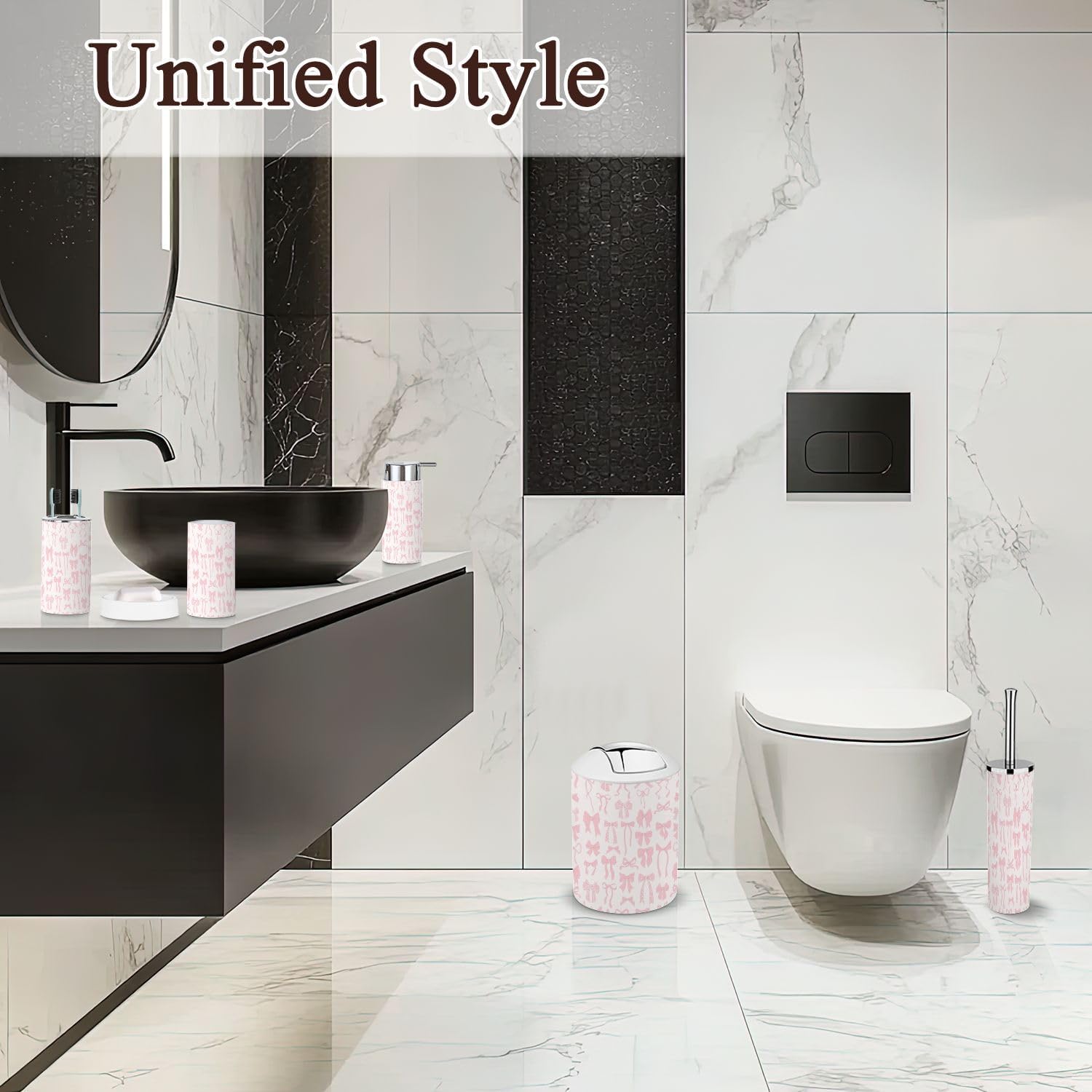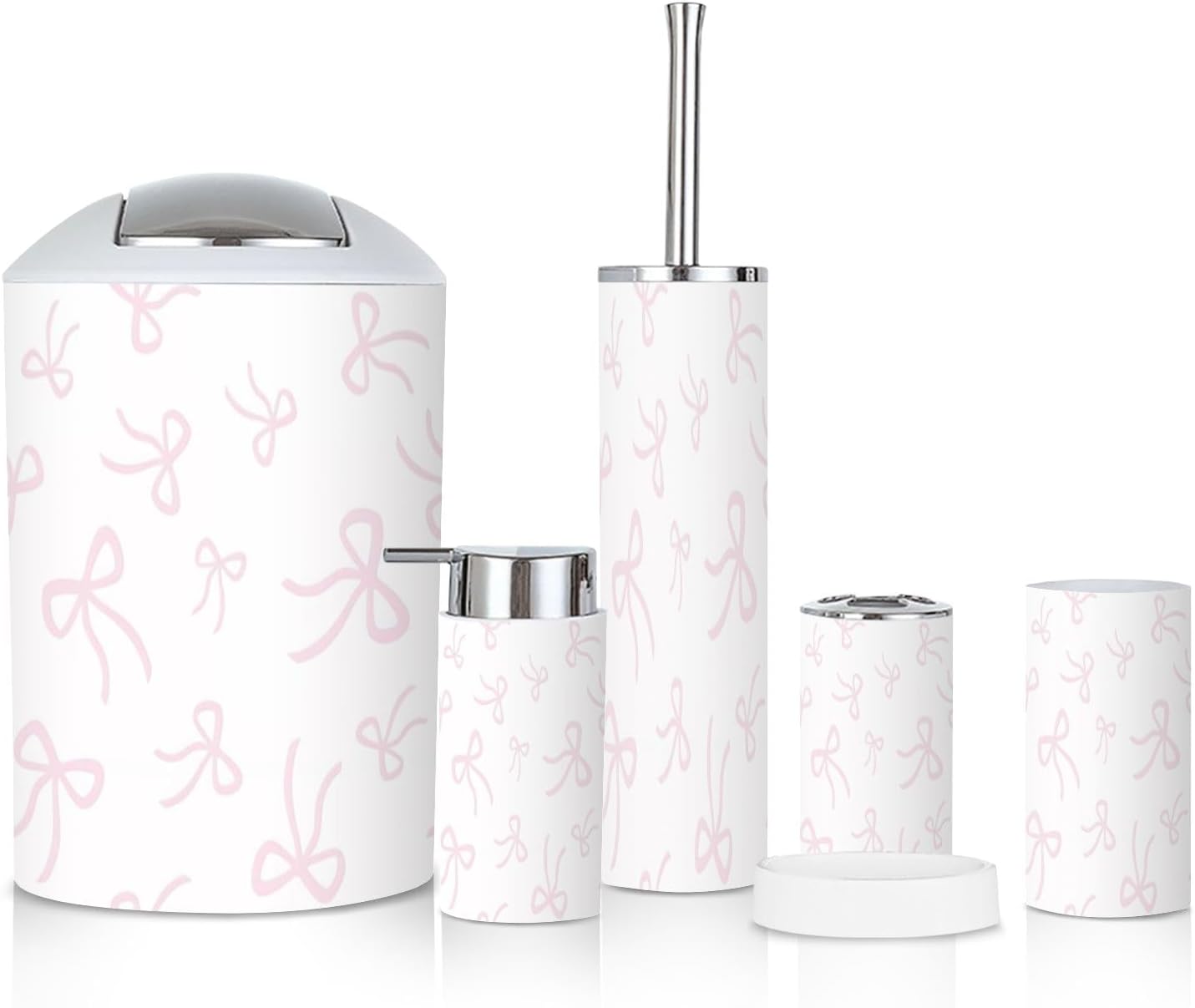 Includes 6 pieces: -Soap dish Keep soap dry. Keep the sink dry without soap stains. -Soap dispenser Press with one hand and it will automatically rebound. You can also put other liquids such as hand soap, dishwashing liquid, lotion, shampoo, shower gel, massage oil, etc. -Toothbrush cup The size is slightly different from the toothbrush holder, which is easy to distinguish. -Toothbrush holder The lid is a petal design, which can keep each toothbrush separate from each other and keep it dry and tidy. The lid is detachable, and you can also use it as another toothbrush cup with your family after removing the lid. -Trash can With a rotatable lid to prevent garbage from being exposed and fix the garbage bag. -Toilet brush The lid is designed not to dirty your hands, and odor will not escape. Attention: 1. Due to manual measurement, there may be slight differences in size. Please confirm the size before purchasing. 2. We will serve you carefully, please ask us if you have any questions.