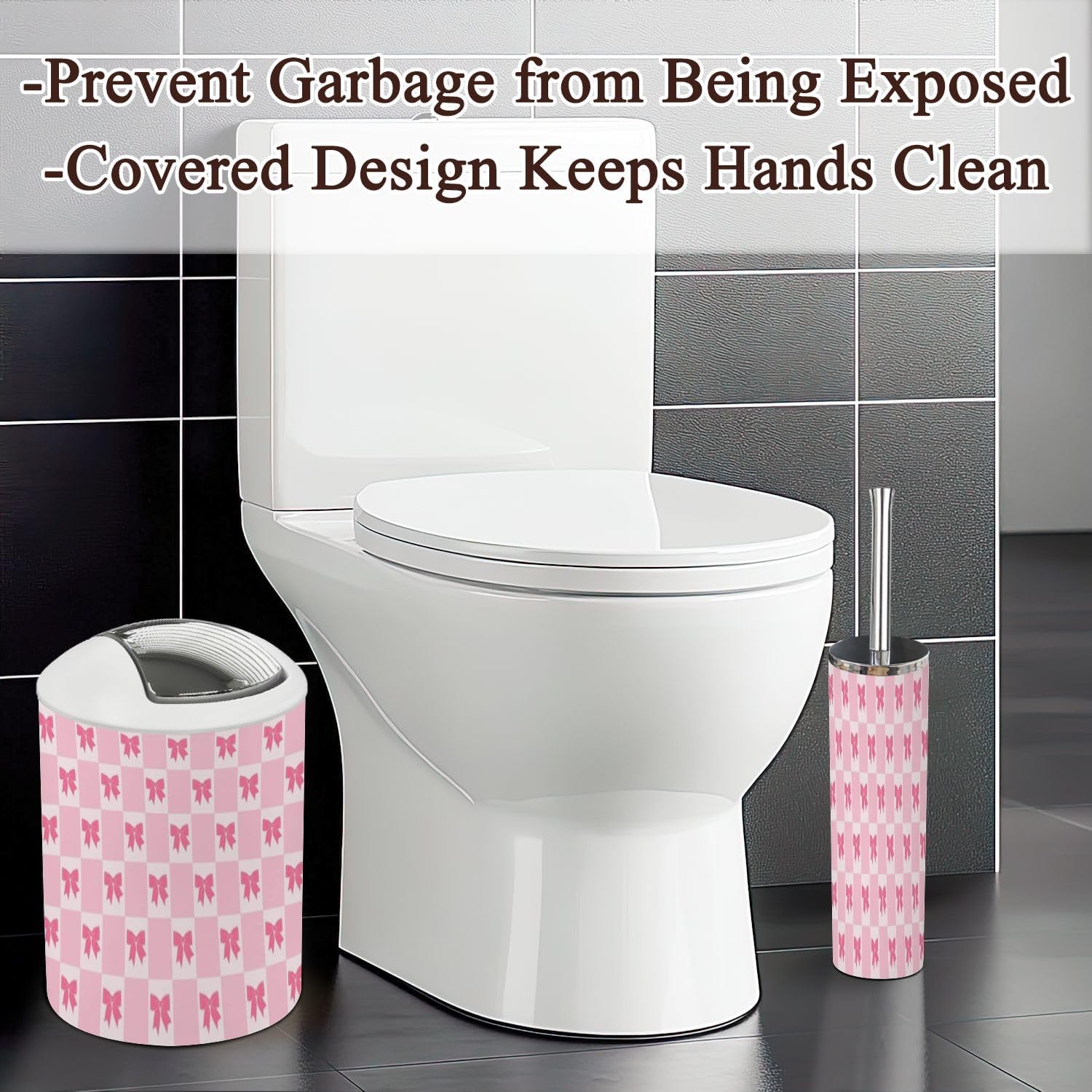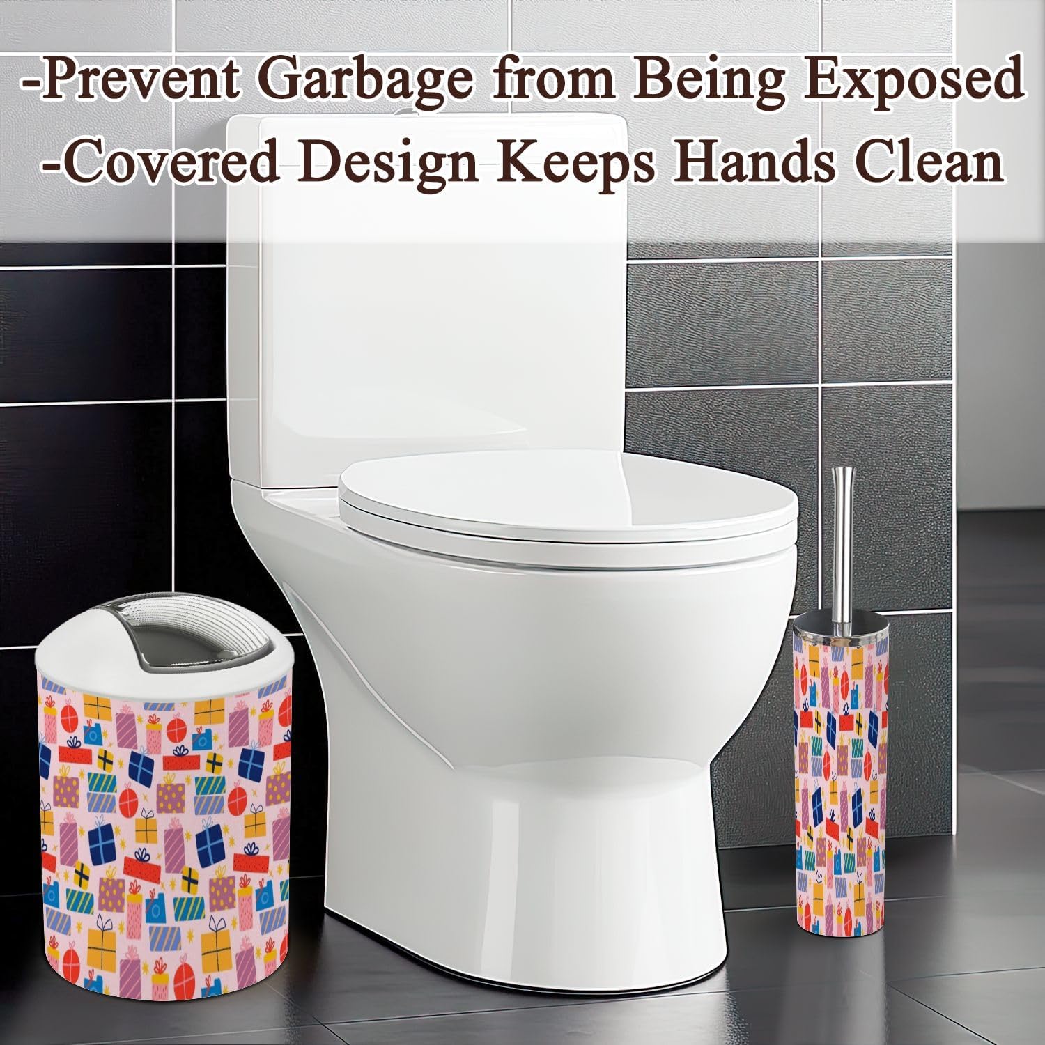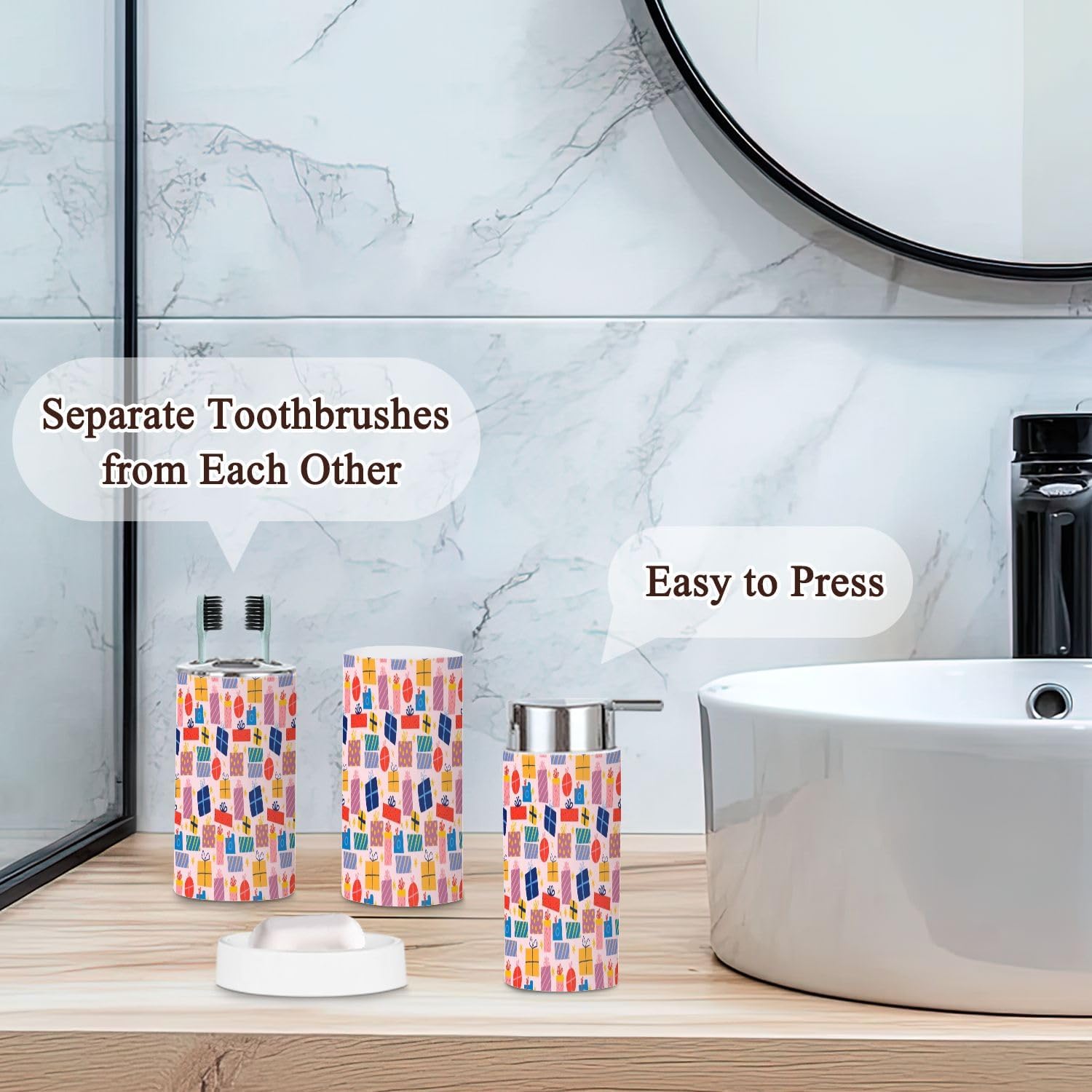 Includes 6 pieces: -Soap dish Keep soap dry. Keep the sink dry without soap stains. -Soap dispenser Press with one hand and it will automatically rebound. You can also put other liquids such as hand soap, dishwashing liquid, lotion, shampoo, shower gel, massage oil, etc. -Toothbrush cup The size is slightly different from the toothbrush holder, which is easy to distinguish. -Toothbrush holder The lid is a petal design, which can keep each toothbrush separate from each other and keep it dry and tidy. The lid is detachable, and you can also use it as another toothbrush cup with your family after removing the lid. -Trash can With a rotatable lid to prevent garbage from being exposed and fix the garbage bag. -Toilet brush The lid is designed not to dirty your hands, and odor will not escape. Attention: 1. Due to manual measurement, there may be slight differences in size. Please confirm the size before purchasing. 2. We will serve you carefully, please ask us if you have any questions.