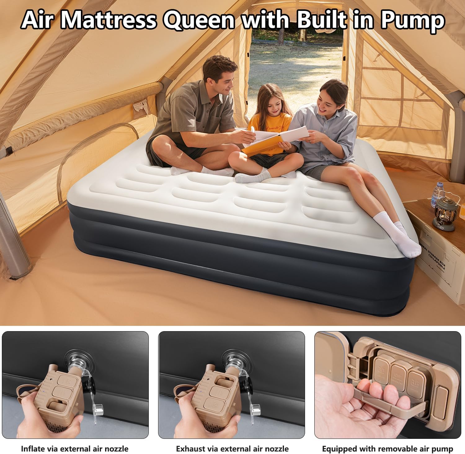 BEBAS Queen Size Air Mattress with Built in Pump Fast Electric Inflation/Deflation Mattress Blow up Bed Inflatable for Home,Guests,Office,Camping Airbed 16 Inch Tall,600lbs Max (1)This queen air mattress 80" L x 60" W x 16" H, delivers a luxurious sleep experience with its soft, velvet-like, waterproof top layer. Perfect for guests, camping, or outdoor excursions. (2) Skin-Friendly Top Flocked: Queen air mattress has multi-layer soft top flocking. High-grade flocking fabric is soft on the skin and breathable. (3) Twin air bed comes with a carrying bag for easy storage and portability. The bag also protects the bed from dust, moisture and damage, prolonging its service life. Whether for guests, friends, watching home theater, taking a break outdoors, traveling or camping, BEBAS inflatables meet your bed needs anytime, anywhere. (4)This car bed features an innovative built-in design that enhances its functionality and convenience. With its 40W power, it provides a quick and efficient inflation process, one-touch button allows for easy operation, making inflation and deflation a breeze. (5)Wireless inflating: Say goodbye to the hassle of manual inflation! The Air Mattress Inflatable Bed features a portable automatic inflatable embedded pump that effortlessly inflates the bed within minutes. (6)PACKAGE: 1 Air mattress, 1 Wireless Air Pump,3 Gas Nozzle,1 USB Charge cable,1 Carrying Bag,1 Instruction Manual (7)Built with the highest-quality materials, the BEBAS air mattress won't sink overnight. Ready to use with your favorite bed sheets, it will help you wake up refreshed and ready to take on the day. (8)Enhanced coil technology provides the support you and your guests need for a sound night's sleep. Air-filled coils and internal layering naturally support the body, keeping the spine aligned as you sleep.