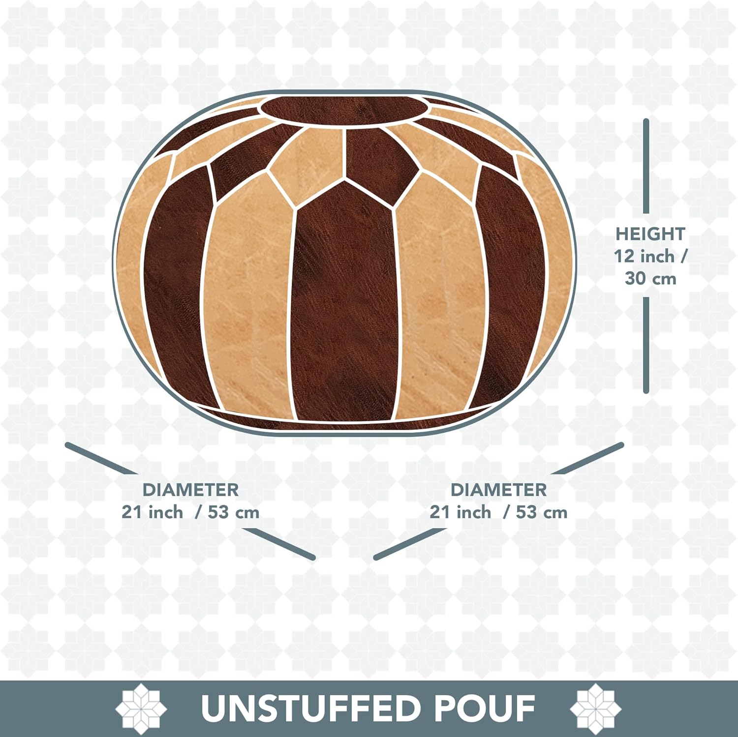 Discover the luxury of full grain Goatbskin leather paired with classic Moroccan design in this ottoman. It's more than just furniture—it's an exquisite addition to your home. Use it as a seat, footrest, or even a stylish table for your favorite books. Its versatility effortlessly fits any room. Crafted using traditional techniques, each leather layer is dyed, tanned, and hand-cut into rounded kite shapes with ancient tools. These pieces are carefully stitched together with nylon thread . the Moroccan Poufs designed with a double layer of material inside for extra strength and durability, ensuring it lasts longer. resulting in the charming round shape of the pouf a testament to skilled craftsmanship and heritage.