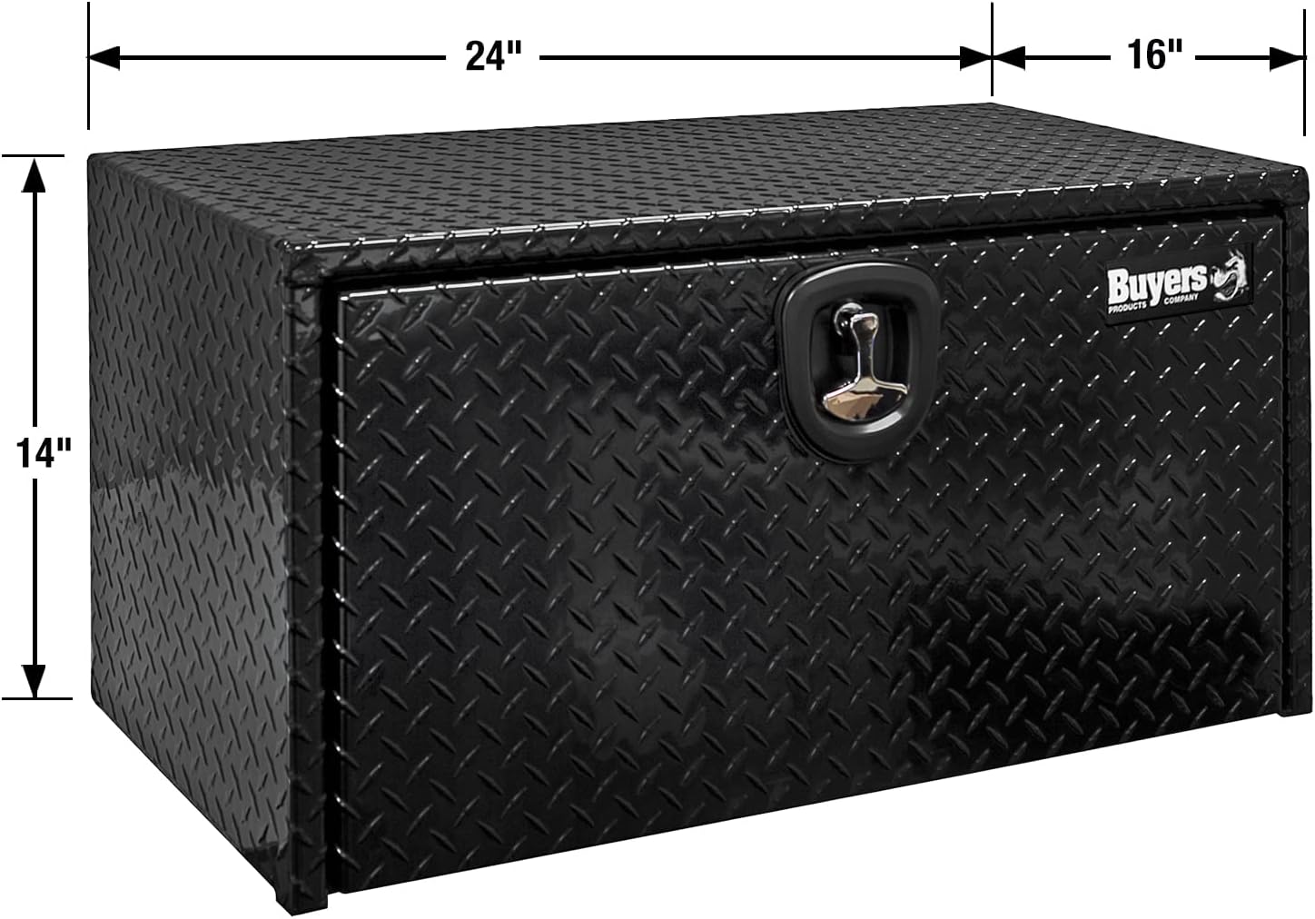 Protect and easily access your equipment with the Buyers Products Black Diamond Tread Aluminum Underbody Truck Box. Available in a variety of sizes, each box is made of strong, corrosion-resistant .100 in. thick aluminum. The black powder-coated finish adds another layer of corrosion resistance and helps keep your box looking great for years to come. The recessed drop door combined with the continuous hidden hinge and replaceable gasket system keep weather and grime away from your tools. Aircraft grade cables help prevent damage. The locking, die-cast compression latch provides a tight seal and deters theft. Mount the box on any flat surface or under your truck using Buyers Products Mounting Brackets (sold separately).