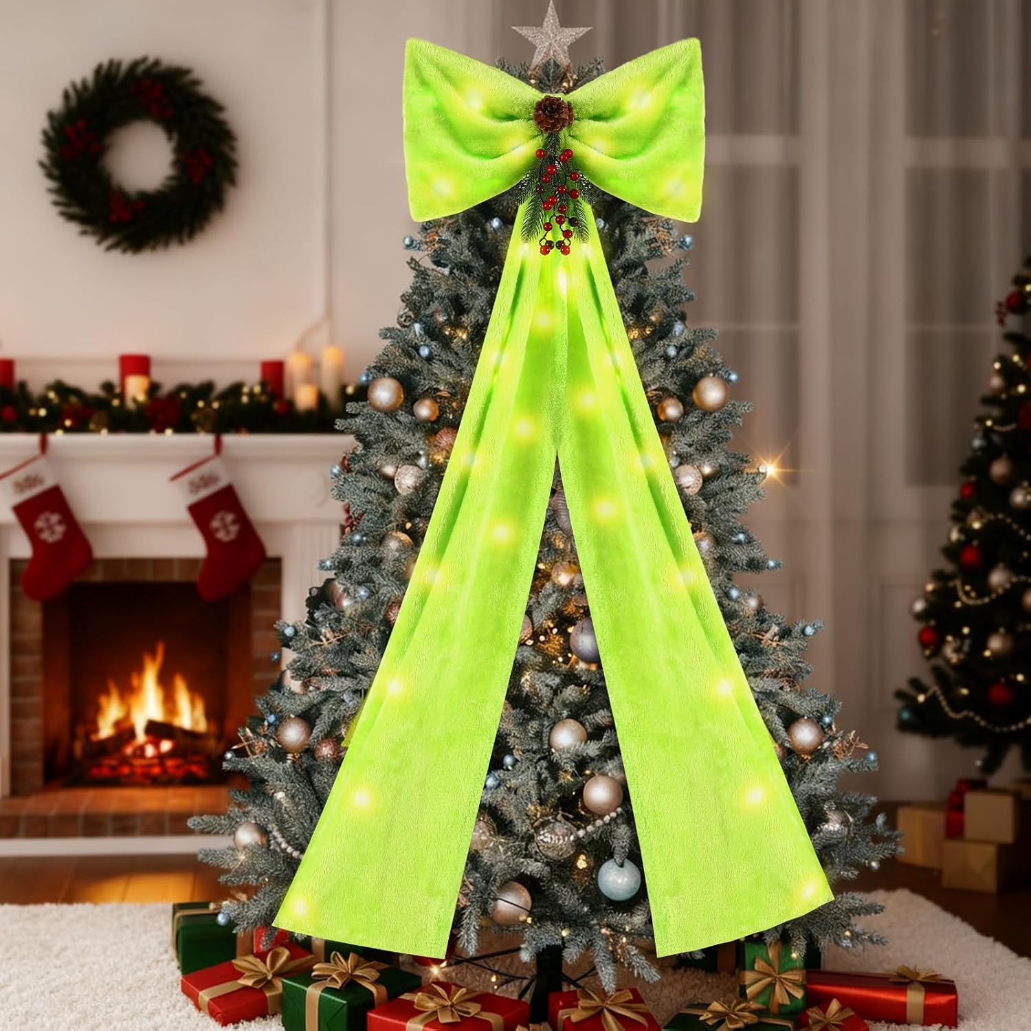 Features: These classical green bow for Christmas tree topper can make a great centerpiece for your Christmas party. These Christmas decorative bows are suitable for wreaths, garlands and Christmas tree during the holiday, the green bow will be attractive. Specifications: Material: short plush, LED Color: lime green Size: 22 x 15 inches Package includes: 1 x Green Christmas bow decorations Notes: Manual measurement, please allow slight errors on size. The color may exist a slight difference due to different screen displays
