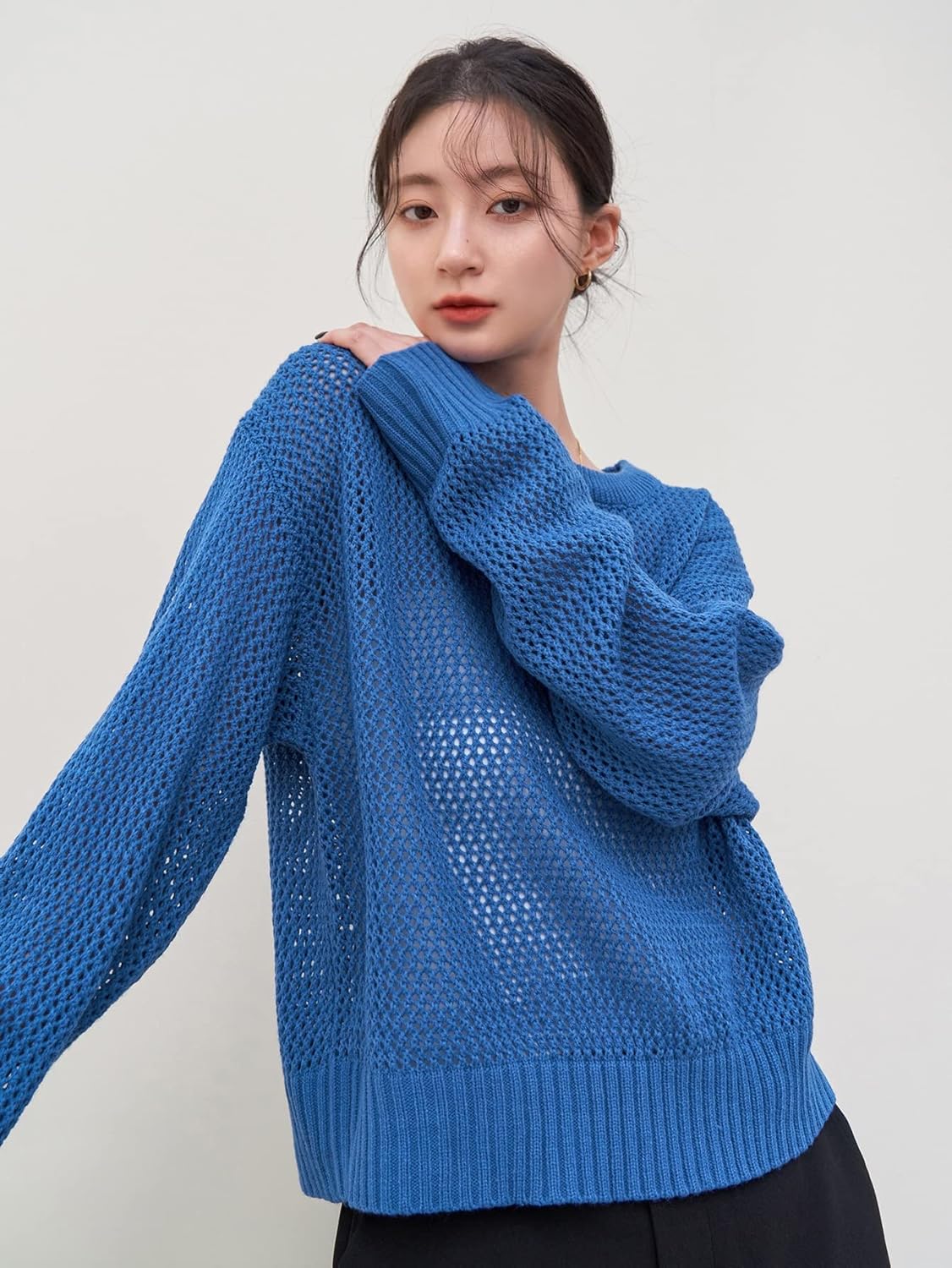 XSBicep Length : 15 inchBust : 37.8 inchCuff : 8.1 inchLength : 20.1 inchShoulder : 16.9 inchSleeve Length : 18.7 inchSBicep Length : 15.7 inchBust : 40.2 inchCuff : 8.6 inchLength : 20.5 inchShoulder : 18.1 inchSleeve Length : 19 inchMBicep Length : 16.5 inchBust : 42.5 inchCuff : 9.1 inchLength : 20.9 inchShoulder : 19.3 inchSleeve Length : 19.3 inchLBicep Length : 17.3 inchBust : 44.9 inchCuff : 9.5 inchLength : 21.3 inchShoulder : 20.5 inchSleeve Length : 19.6 inchColor: BlueStyle: CasualPattern Type: PlainType: PulloversNeckline: Round NeckSleeve Length: Long SleeveSleeve Type: Drop ShoulderLength: RegularFit Type: Regular FitFabric: Medium StretchMaterial: FabricComposition: 100% AcrylicCare Instructions: Machine wash or professional dry cleanSheer: Semi-Sheer