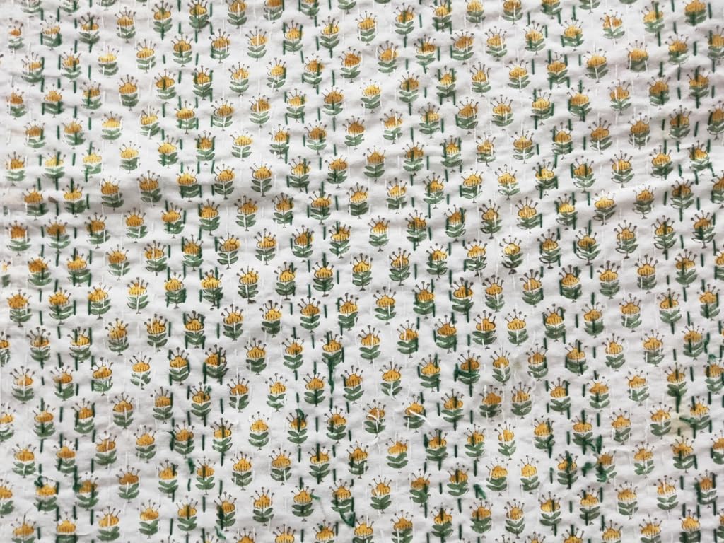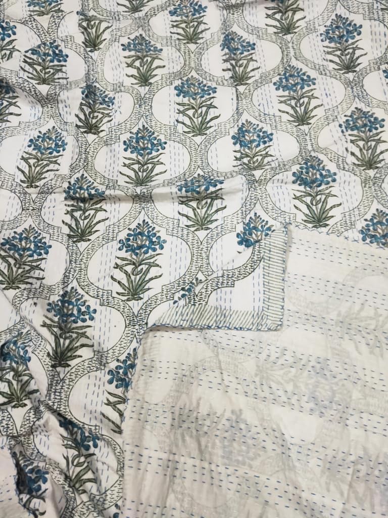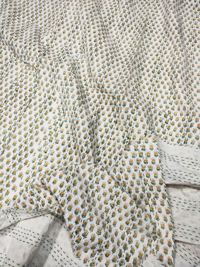 A beautiful creation to give your home a traditional yet authentic colorful look with this beautiful kantha quilt blanket or throw which can also be used as handmade tropical Kantha bedspread bedding. This piece is of art is completely hand stitched by Women artisan in Rajasthan, India. The entire quilt is hand embroidered with end number of straight running stitches to create a unique product, one of it's kind.These quilts are famed and admired due to their Kantha work. They have different beautiful warm and charming colors, designs and patterns on either side which gives a distinct look.
