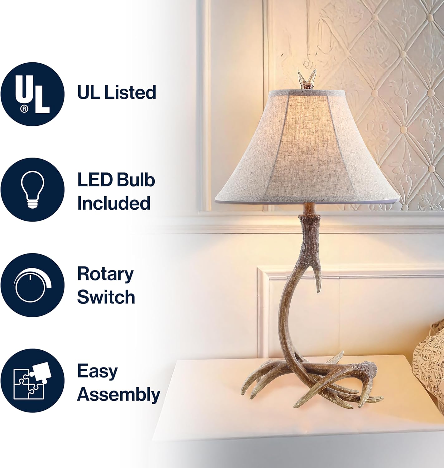 Create a classic lodge feel in your home with this rustic table lamp. Featuring a faux antler base, this nature-inspired lamp is beautifully rugged and artistic. The natural linen drum shade diffuses the light for a soft, warm cabin glow.