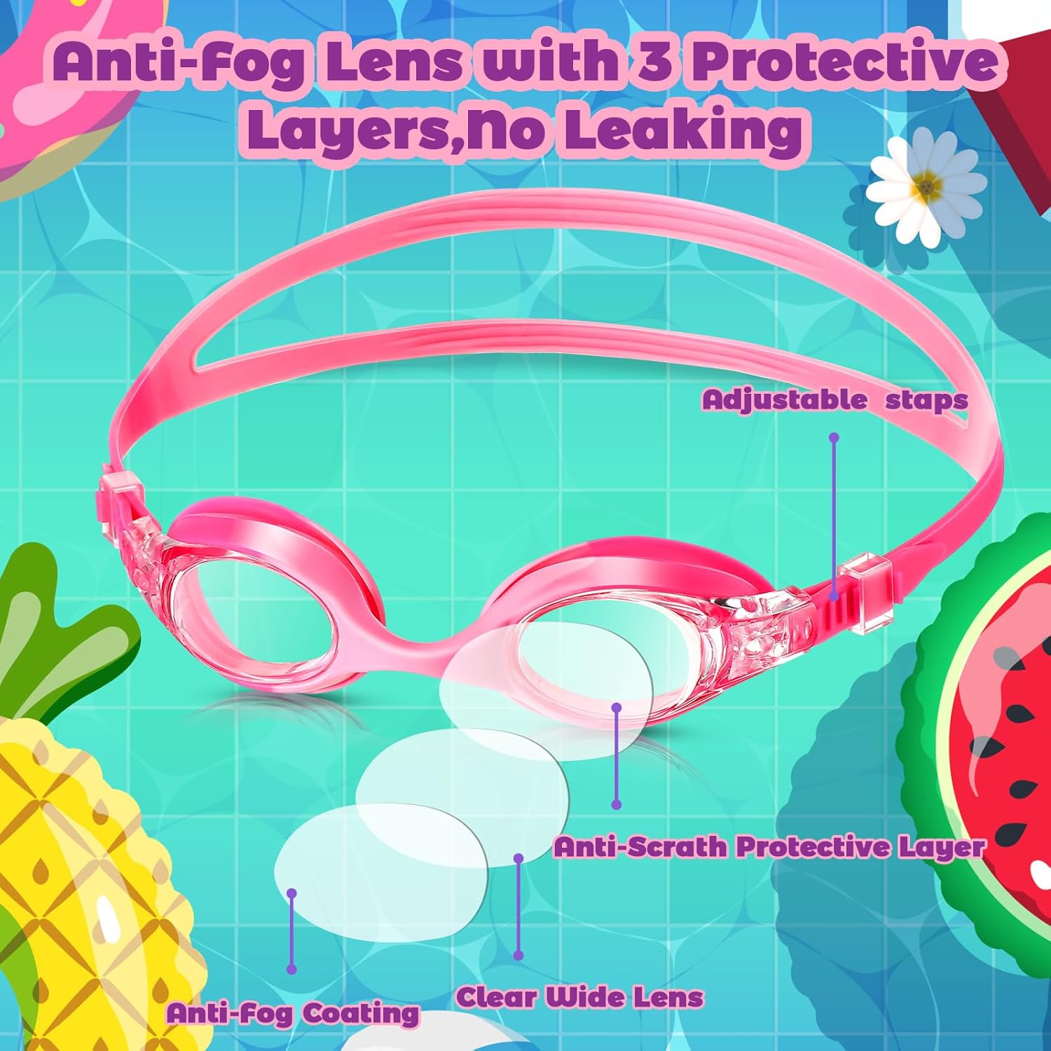 Features: More scenes to apply: The swim glasses for kids are widely applicable to swimming pools, rivers, oceans, water parks, swimming lessons, swimming matches, or some other water sports or underwater sports. Utility gift ideas: These pool goggles glasses for swimming kids are feasible to be sent as gifts to your kids, or children of your friend, colleagues, neighbors or family, making them feel your sincere care, love and thoughtfulness. Specifications: Material: Strap: silicone Lens: PC Size: as pictures shown Package includes: 12 x Kids swim goggles 12 Sets of nose clips and ear plugs Warm notes: Please note the size detail information before ordering. The goggles are suitable for children at the ages of 3-15. Manual measurement, please allow slight errors on size. The color may exist a slight difference due to different screen displays