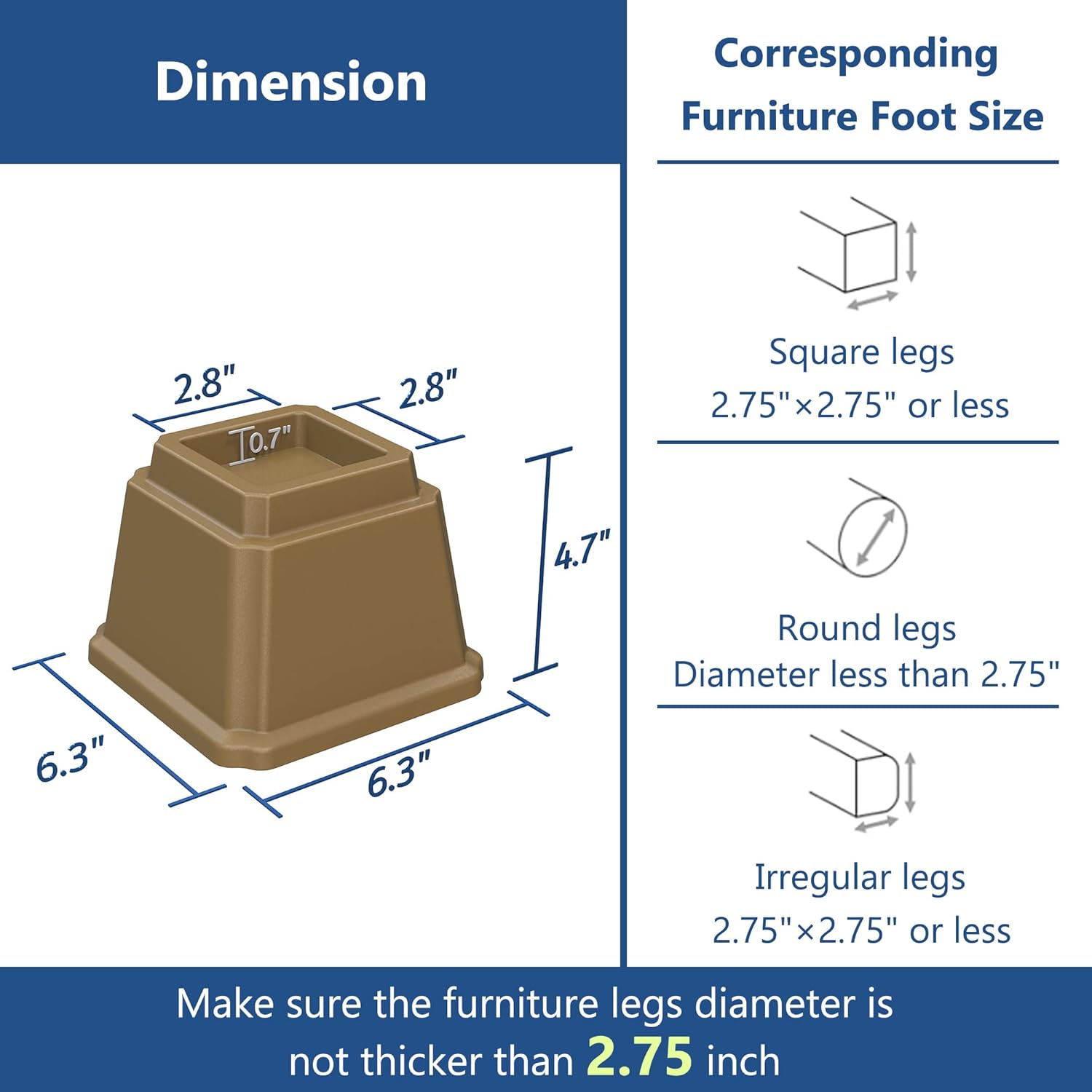 • Easy to use: The furniture risers 4 inch internal Size: 4"(W) x 4"(D) x 0.5"(H). Please make sure the furniture legs diameter is not thicker than 4". The smooth surface avoids toe impact with sharp legs.
