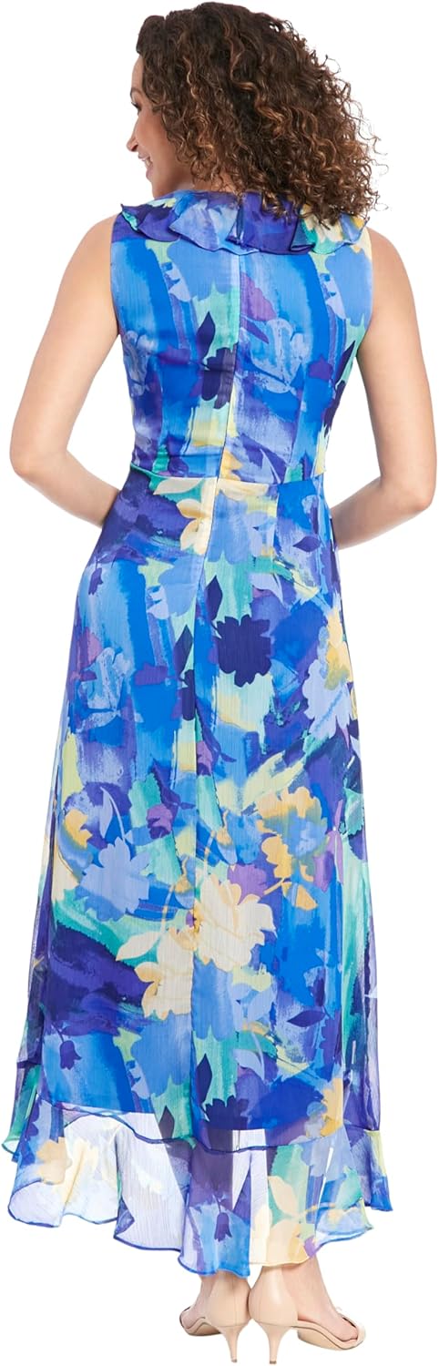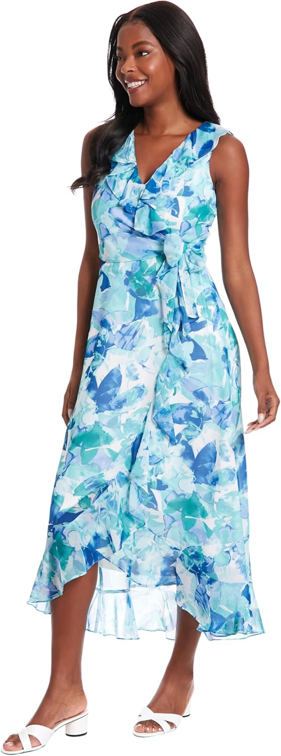 The London Times Meryem dress is a delightful and feminine piece with a playful ruffle front and hem, creating a chic and stylish look. The faux-wrap design adds a touch of sophistication, and combined with the charming floral pattern, makes this dress a perfect choice for various occasions where you want to showcase both modern elegance and a hint of natural beauty.