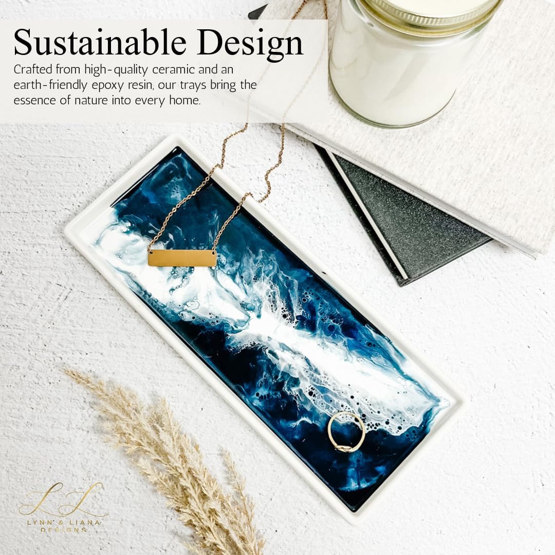 Ceramic Vanity Tray Elevate your bathroom decor with our exquisite ceramic and resin trays, meticulously crafted to perfection. Serving as the ultimate accent piece, these trays not only enhance the ambiance of any room but also double as stunning jewelry trays. Available in a range of captivating colors, they add a touch of sophistication to your space while providing practical functionality. Choose from merlot, ocean vibes, navy and white, metallic, marble, gold quartz, sapphire sky and onyx, caribbean blue, black ember or jade. Our versatile small rectangular tray is perfect for both storage and decoration. Whether placed near the bathtub to hold your essentials or adorning a bedroom as an elegant accent piece, it effortlessly elevates any space. Add candles, perfume, cologne, makeup, jewelry, and more to create a personalized touch. Utilize it as a nightstand tray for bedside essentials or adorn your office desk with trinkets. With its stylish design, this tray serves as a stunning centerpiece for any surface, enhancing both functionality and aesthetic appeal. Lynn & Liana Designs is a family business based out of Steinbach, Manitoba, Canada. We were inspired to go into business when we came across a new resin product, made by our friends at EcoPoxy. Their new product, UVPoxy, is an Earth-Friendly resin made. with recycled bioproducts. When we saw how beautiful the resin was, we wanted to create something new and special with it. So, we combined the earth sustainable resin with gorgeous hardwoods and our line of cheese boards and serving trays was born! Our items are one of a kind, hand-poured, meticulously crafted individual works of art. No two items are the same. Our serving tray makes for a beautiful charcuterie spread and great conversation pieces at dinner parties. Best of all, when you’re not serving on them, they add a pop of color to your home decor. Additionally, Our bathroom counter trays add unique style and beauty to any room.