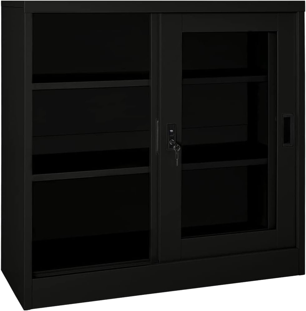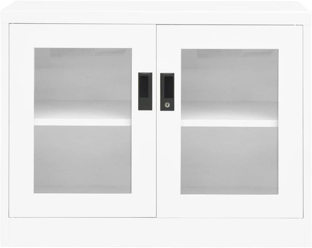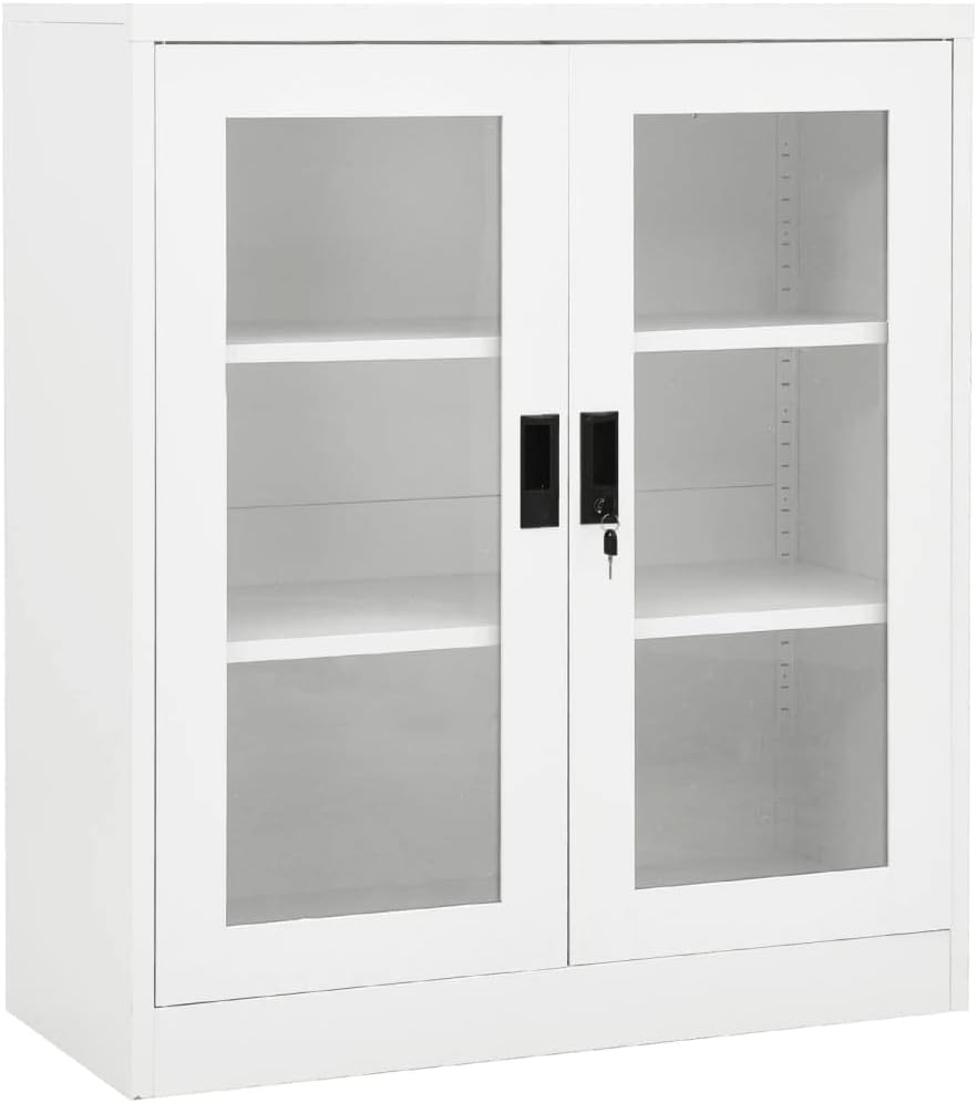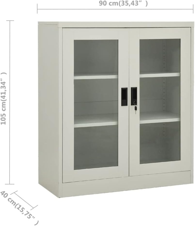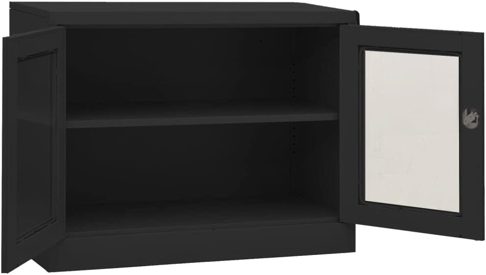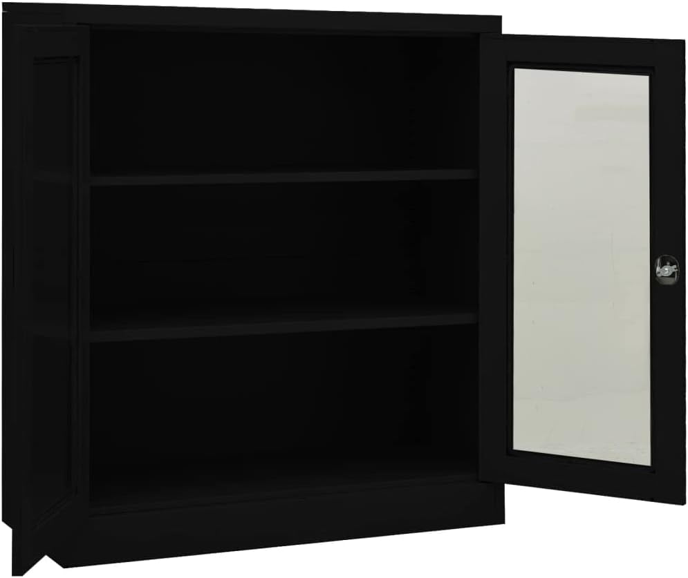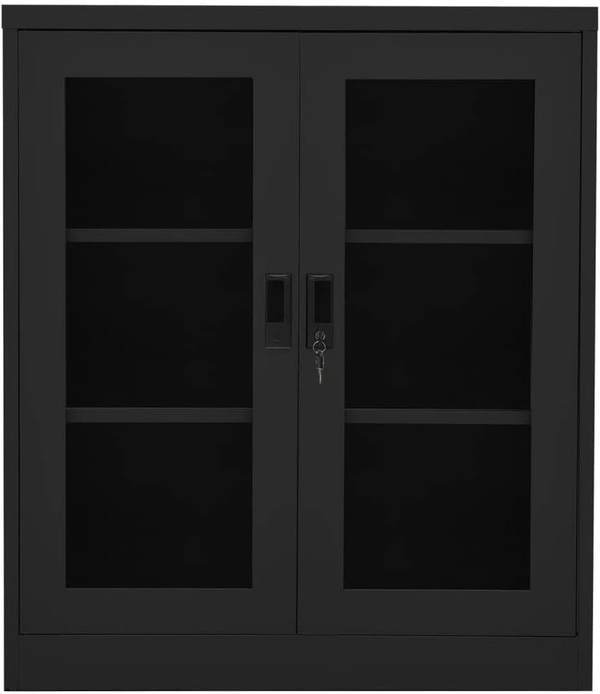 This office cabinet, with a typical filing cabinet design, is ideal for file storage.With 3 adjustable shelves and a lock, this file cabinet allows you to neatly sort your files into different categories and keep files safe. It will suit any office decor thanks to its iconic design. And the distinctive tempered glass doors make it easy for you to see through and get the file you want.This office cabinet is made of steel, making it durable as well as easy to clean.This office cabinet, with a typical filing cabinet design, is ideal for file storage.With 2 adjustable shelves and a lock, this file cabinet allows you to neatly sort your files into different categories and keep files safe. It will suit any office decor thanks to its iconic design. And the distinctive tempered glass doors make it easy for you to see through and get the file you want.This office cabinet is made of steel, making it durable as well as easy to clean.Color: AnthraciteMaterial: Steel, tempered glassDimensions: 35.4" x 15.7" x 35.4" (W x D x H)With 2 doors, 2 handles and 2 adjustable shelvesIncluding 1 lock and 2 keysLoading capacity per shelf: 66.1 lbTotal loading capacity: 132.3 lbAssembly required: YesWARNING: In order to prevent overturning, this product must be used with the wall attachment device provided.