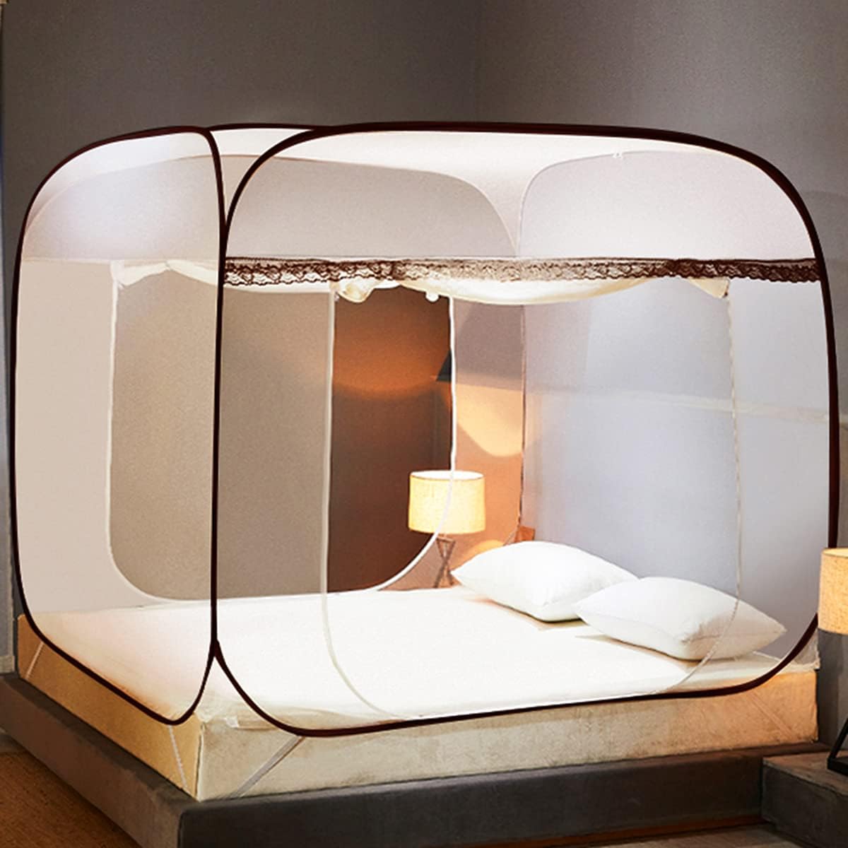 The dome of the mosquito net can be folded and unfolded in the blink of an eye, easy and quick to install. Portable, compact, easy to fold, store and transport, you can also carry it with you when traveling or camping; The three door with two-way zipper makes it easier for you to get up and go to bed.SPECIFICATIONS:Shape: Mongolian Yurt.Material: Polyester + Steel wireType: 3 doors.Uses: Indoor Use, Outdoor Use, Camping, Travel.Features: Foldable, Easy to Store.Size: (Fit the size of the bed)1.5m×2.0m×1.5m, for 1.5m bed1.8m×2.0m×1.55m, for 1.8m bed1.8m×2.2m×1.55m, for 2.0m bed2.0m×2.2m×1.6m, for 2.0m bedPackage Includes: Folding Mosquito Net x 1