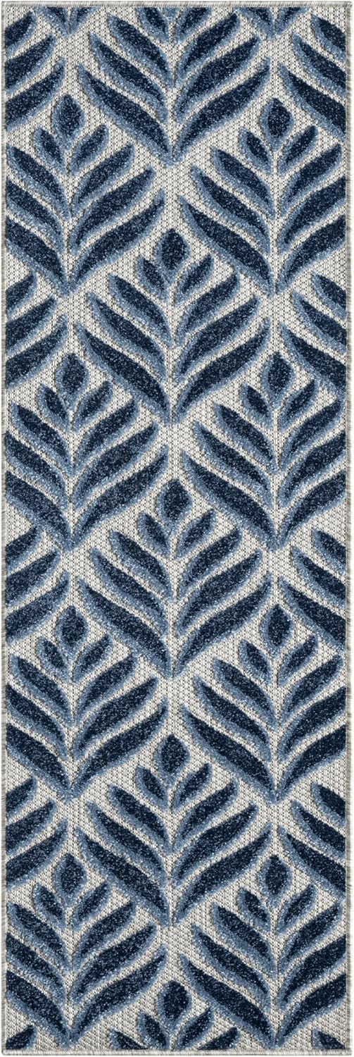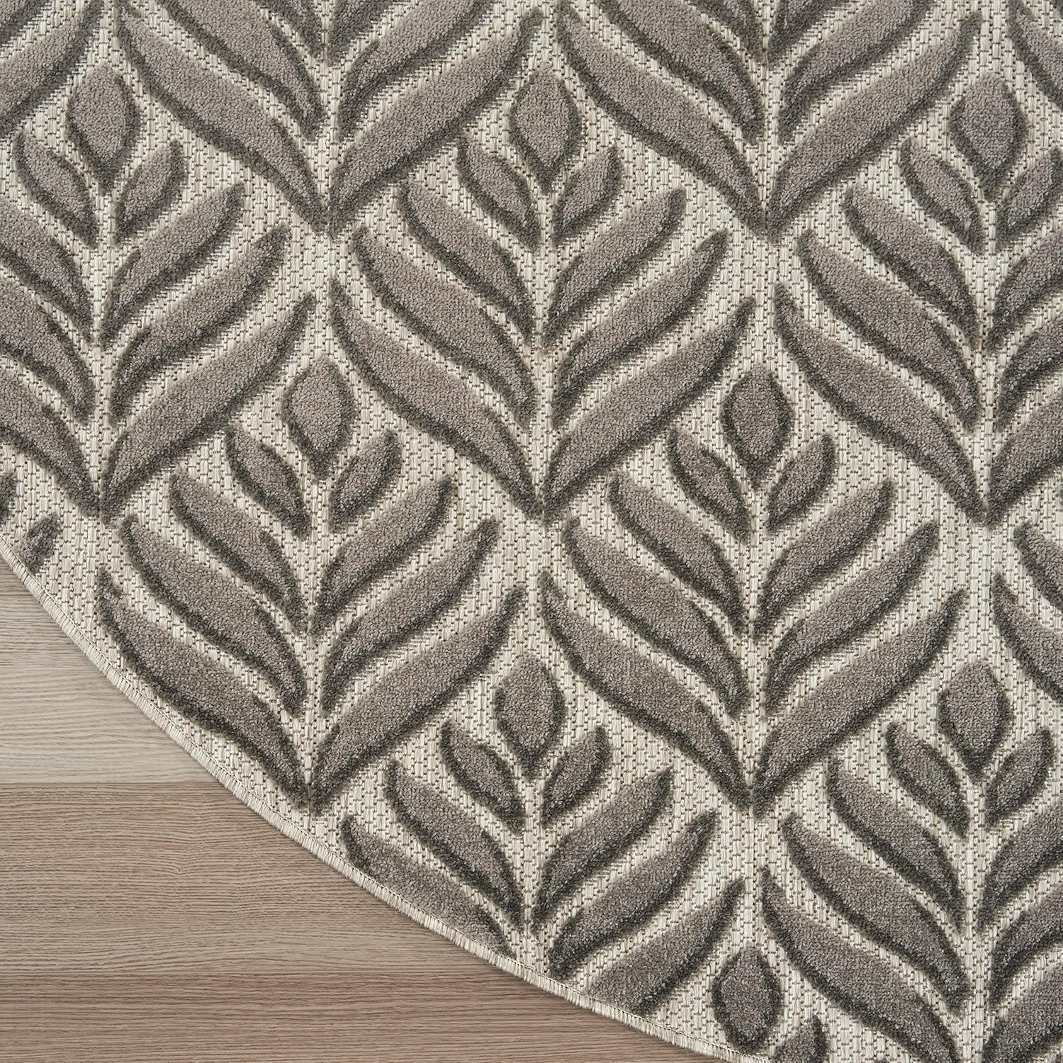 This sunny and sensational collection of flat woven outdoor rugs is pretty, practical and simply perfect for high traffic areas. With its inviting assortment of classic and contemporary designs, tempting color palettes and terrific textures, these multipurpose rugs will afford an air of simple sophistication to any environment.100% Polypropylene • Flat Woven Tropical meets modern with this grey outdoor rug from the Aloha Collection. The flatwoven design is adorned with a raised, repeat palm leaf pattern that adds a subtle layer of dimension. Presented in calming colors, this botanical rug beautifully complements your patio, balcony, or deck. Made from durable polypropylene yarns that make it great for use in high-traffic indoor spaces as well, such as your kitchen, dining room, and living room.
