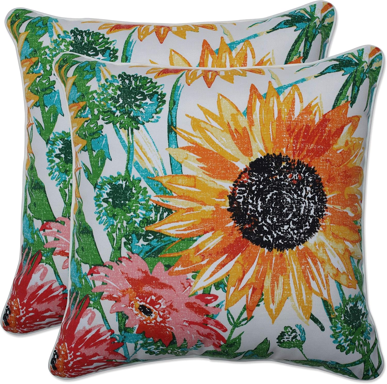 Style blooms with the fun floral pattern of this set of two outdoor decorative pillows. Multicolored flowers in shades of blue, gray, orange, tan and red are set on an off-white ground surrounded with curling vines in a shade of dark gray. This versatile pattern easily pairs with light or dark furniture. Additional features of these outdoor decorative pillows include self welt cords for a clean finish and recycled polyester fiber fill with sewn seam closures. Also suitable for indoor use.
