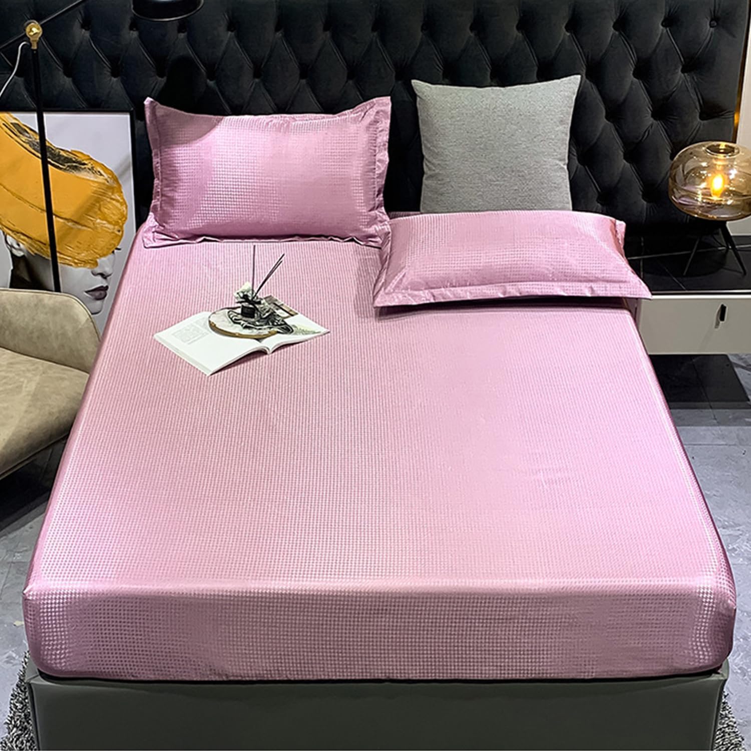 Are you still troubled by the hot summerOr are you still troubled by the stuffy sheetsYou need this breathable and cool ice silk fitted sheetEasy to useExcellent cooling effectYour summer essentialsFabric:Cool ice silk FabricPrinting And Dyeing Process: Reactive Printing And DyeingFeatures: cooling, Breathable, DustproofThickness of mattress that can be accommodated: below 25cmColor:Blue,Grey/A,Purple,Coffee,Grey/B,Green,PinkSize:150*200cm(59*79in)queen180*200cm(71*79in)kingnotes:1. Please allow 1-3cm error due to manual measurement.2. Due to different monitors, there may be slight color differences. We hope you can understand.Package Includes:mattress protector * 1 and pillowcase * 2