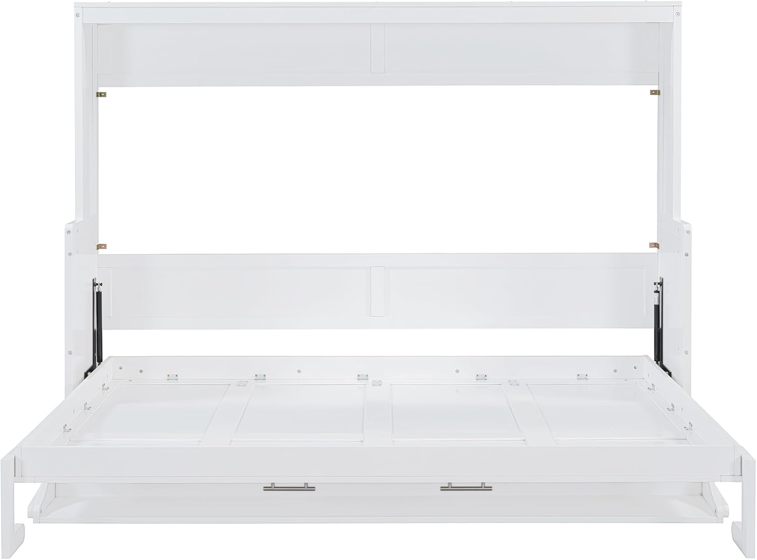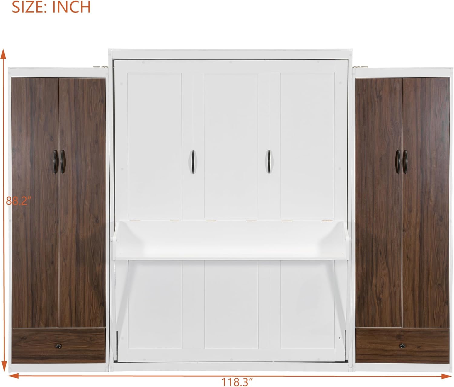 ♬ Maximize your space with our Queen Size Murphy Bed, designed to transform any room into a multi-functional haven. This innovative piece features a sleek, space-saving design with built-in storage solutions. One side of the bed is equipped with a versatile cabinet and a spacious desk for all your work or study needs, while the other side showcases a flip-up vanity with a mirror and additional storage. Perfect for apartments, guest rooms, or studios, this Murphy bed is the ultimate solution for both comfort and functionality. ● Weight & Dimensions Overall Product Dimension 126.2"L x 86.9"W x 88.2"H Number of Package 3 Weight Capacity 400 lbs Recommended age 6+ Recommended Mattress Thickness 8" Specifications Product Type Murphy Bed Size Queen Color White/Espresso Material Plywood+MDF+Pinewood Assembly Required Yes Country of Origin Vietnam ● Notes Manual measurement has been used,there may be some reasonable error. All the pictures are taken by actual samples, slight chromatic aberration may occur due to lighting or display.
