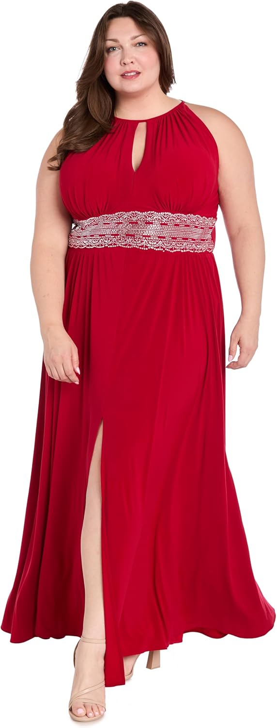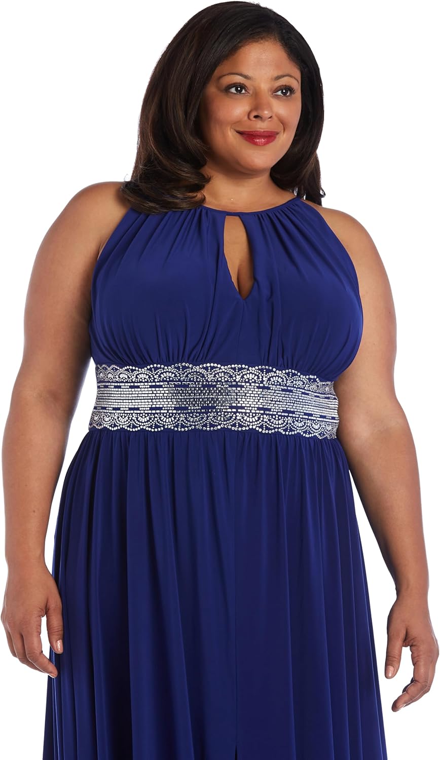 A graceful evening wear from R&M Richards' Collection. The stunning empire style offers a feminine and romantic silhouette. Tailored to accentuate the body's contours, this gown gives you a sleek and refined aesthetic. Features a full length, sleeveless dress with beaded waist, keyhole cutout in the back and hidden zipper closure. A dress that requires minimal accessories, saving you time and effort while still making a bold and unforgettable impression. Suitable for upscale galas, formal events, or any occasion where making a lasting impression with timeless glamour is.