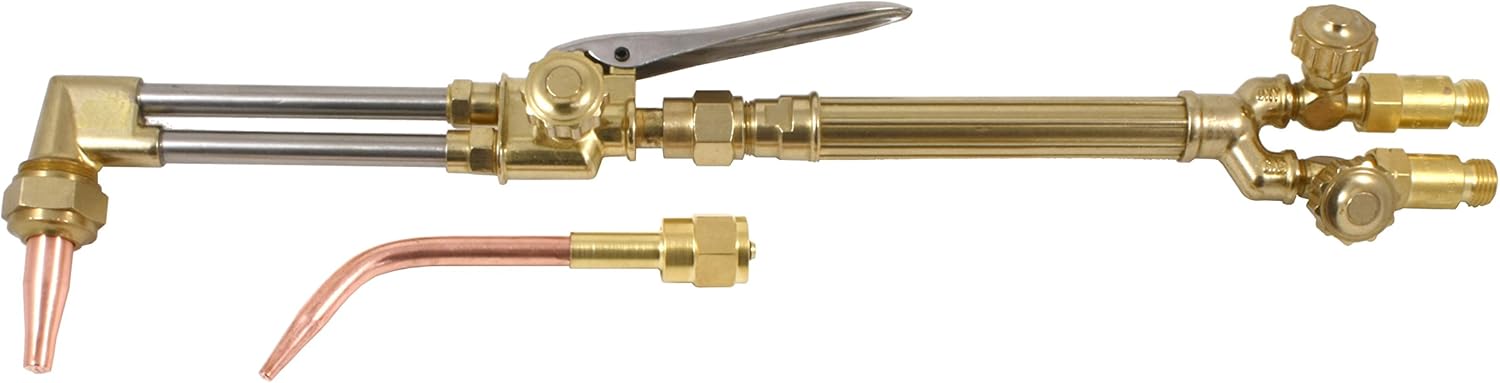 Die Forged Brass Medium Duty Torch Replacement for Victor Series 100 Torches. Uses Series "3" Cutting Tips (Small Tips) and compatible with Victor Series 100 Welding and Heating Tips. Included Size "2" Acetylene or Propane Tip. Can Cut up to 1" (Thicker or Thinner cuts can be achieved with additional number tips - See table in picture Nº: 5). Versatile options: choose from torch configurations with cutting, welding, and/or heating tips, as well as separate Cutting Attachment and Torch Handle units for customization. Complete torch options includes Check valves for additional safety - Use of flashback arrestors is always recommended. Assembled Handle + Cutting Attachment Total Length: 17" - Total Weight with Cutting Tip: 1 Lb - 14Oz. Hose connectors size 9/16"-18 RH and LH
