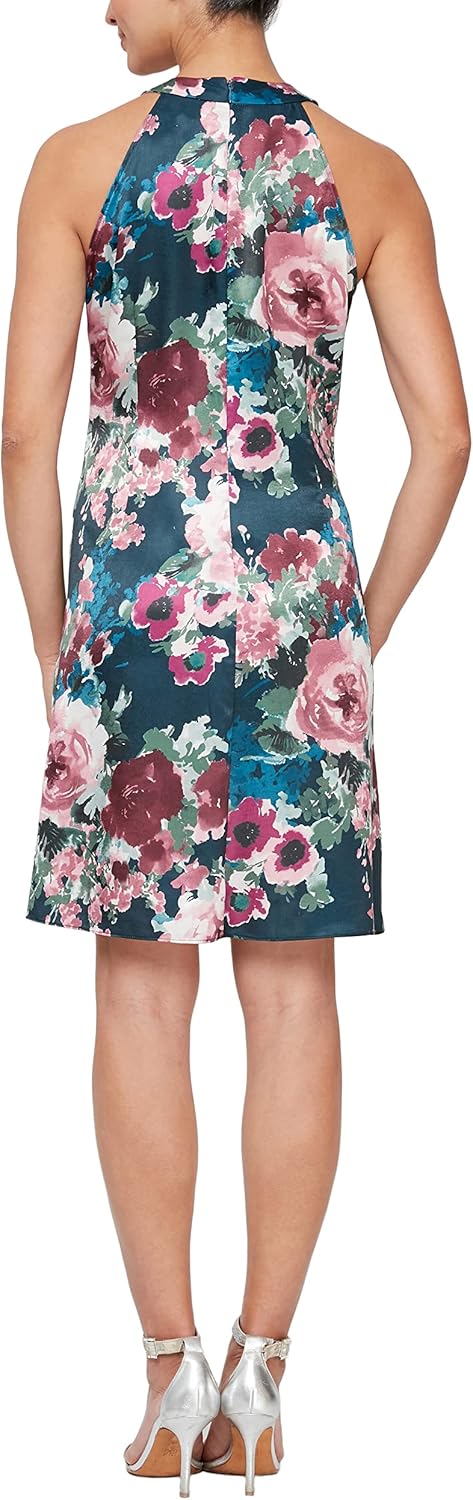 This mini chiffon dress boasts a beaded halter neck and a graceful cascade ruffle down the center. It's light and ideal for spring and summer events.