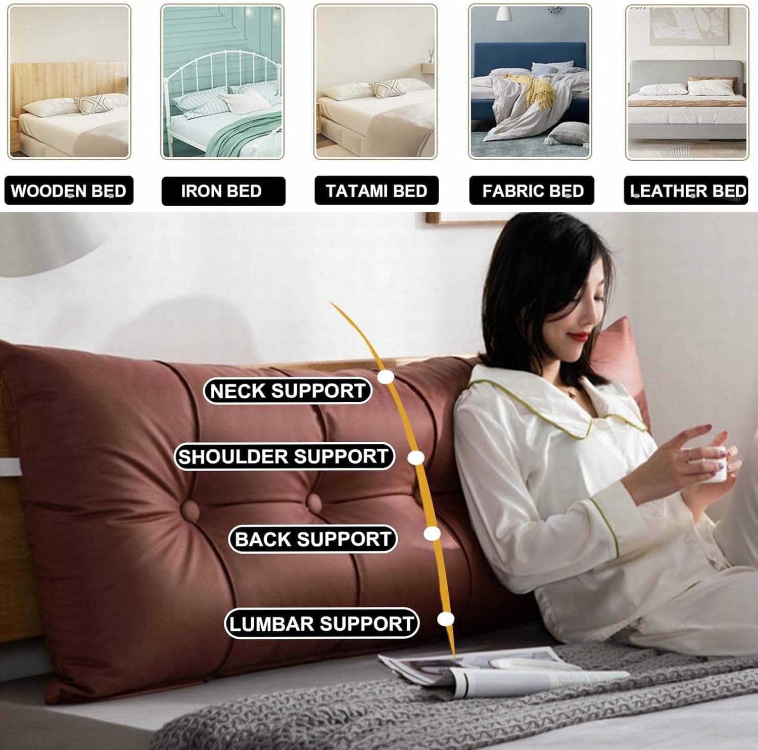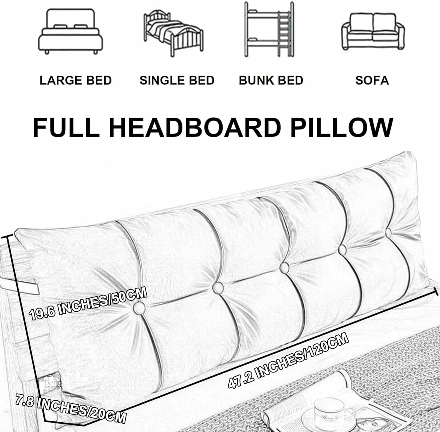 Triangular reading pillow headboard cushion cover is made of soft technical cloth fabric,padded with high resilience pp cotton, the wedge cushion offers a comfortable back and neck support when reading and watching TV.Large headboard pillow much softer and more adaptable than a headboard. If you want to lie flat but still get neck and head support, you just lay it down and have the flatter end near your neck. Product name: Headboard CushionSurface fabric: technical cloth fabricApplicable people: Adults/Kid Firmness: medium softFilling material: PP cottonThickness: 7.8 inches/20cmVariety:Bedside Wedge Pillow,Sofa Pillow,Headboard Backrest, Leg Lift Pillow,Pregnant Woman Support Pillow, Rest pillow, etc.Applications: Bedrooms, Dorms, Sofa Bed,Hotel,Bay windows,Tatami.Dimensions (L x H x D):Twin Size: 39.3x19.6x7.8 inches/100x50x20cmFull Size: 47.2x19.6x7.8 inches/120x50x20cmQueen Size: 59x19.6x7.8 inches/150x50x20cmCalifornia King Size: 70.8x19.6x7.8 inches/180x50x20cmKing Size: 78.7x19.6x7.8 inches/200x50x20cmPackage Included:1 x headboard pillow