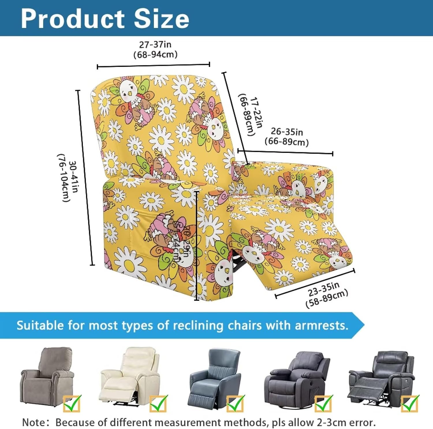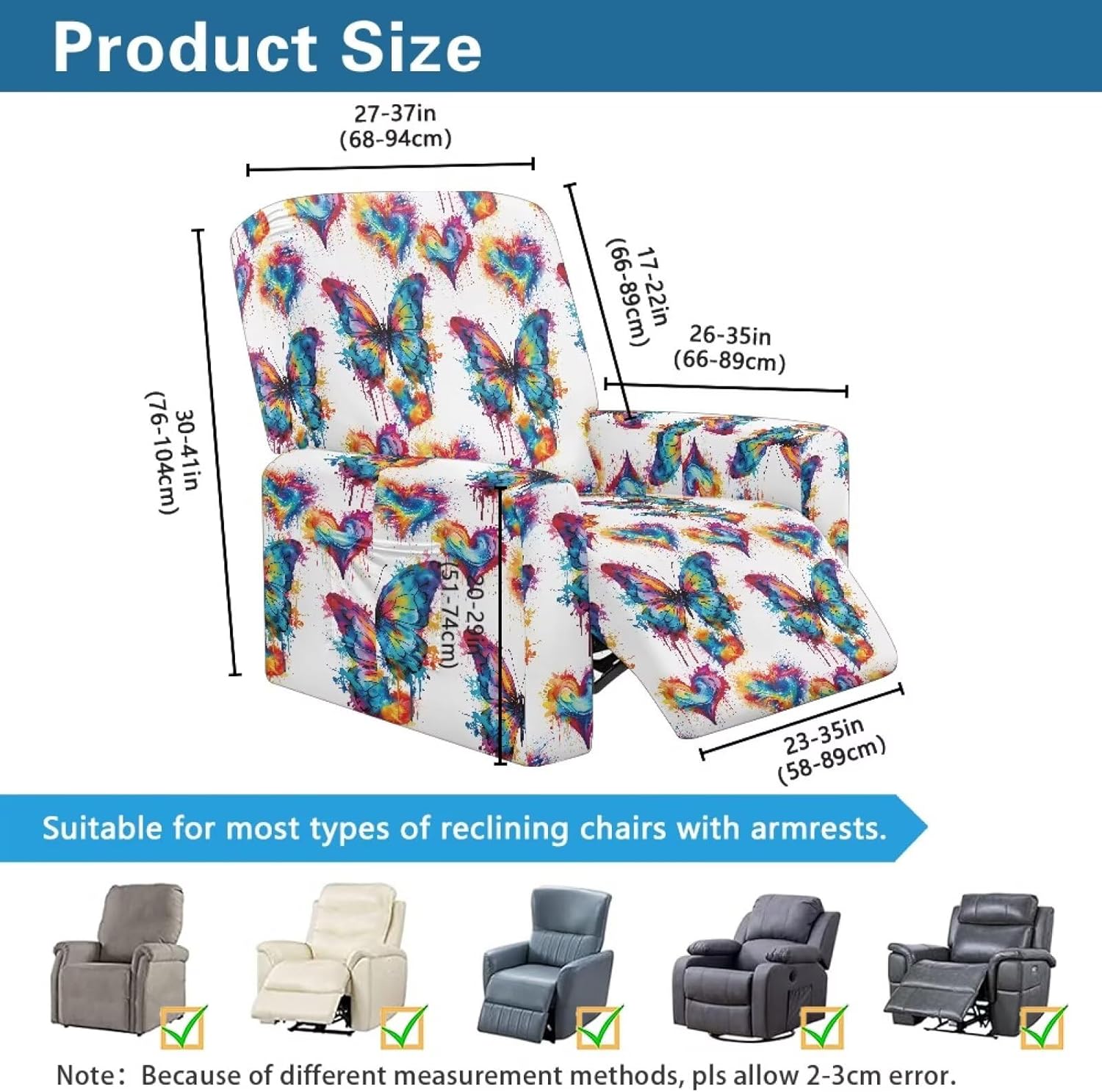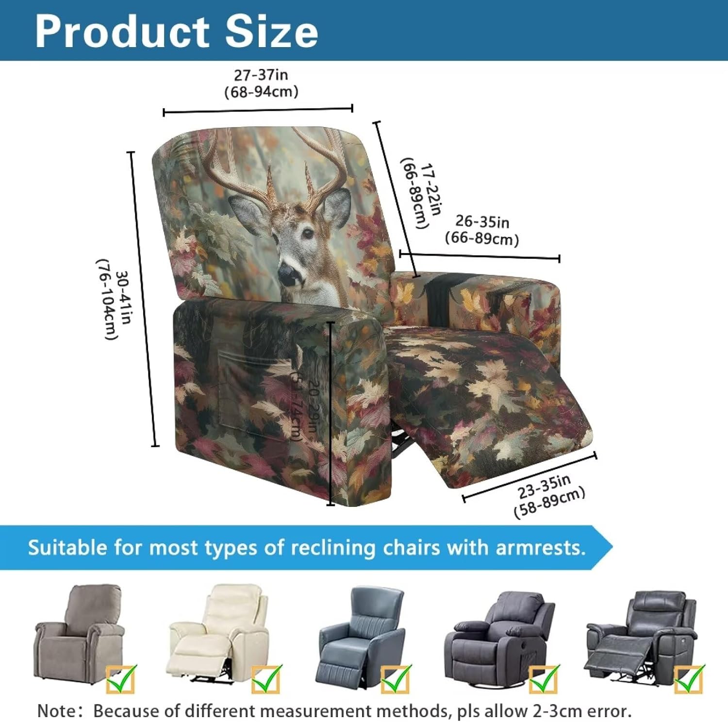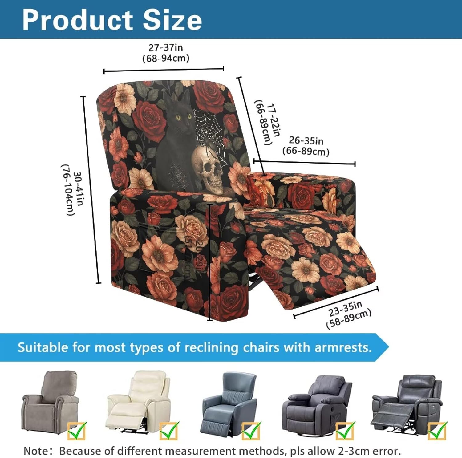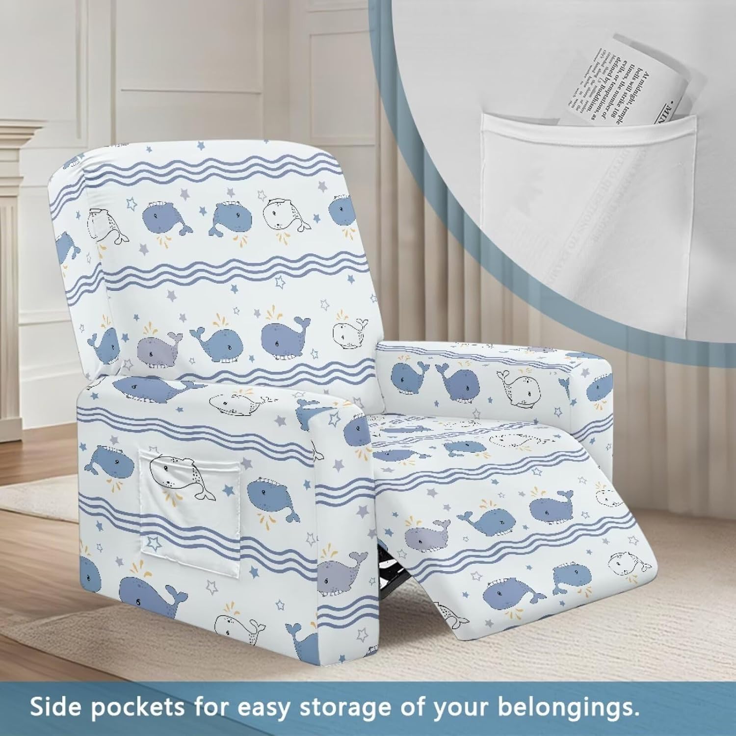 Revitalize Your Recliner with Premium Stretch Covers Give your favorite recliner a stylish makeover with our perfectly fitted stretch covers! Designed to accommodate most standard recliners, these covers fit back widths of 27-37", heights of 30-41", bottom widths of 23-35", and side widths of 26-35". The stretchy fabric ensures a snug, custom-like fit that instantly refreshes your furniture's appearance. Crafted from a premium polyester-spandex blend, our covers feature a beautiful jacquard pattern that adds elegance to any room. The ultra-soft material is highly durable, wrinkle-resistant, and maintains its shape through repeated use. The four-way stretch fabric moves with your recliner for uninterrupted comfort. Shield your recliner from everyday wear and tear with our full-coverage design. These covers provide defense against spills, pet hair, dust, and friction damage. By preventing stains and fabric deterioration, they help extend your furniture's lifespan while keeping it looking fresh and new. Each set includes a back cover, seat cover, and two arm covers for complete protection. The convenient side pockets are perfect for storing remotes, reading glasses, or magazines - keeping essentials within reach while maintaining a tidy living space. The non-slip elastic hem ensures the covers stay securely in place. Keeping your recliner looking its best has never been easier! The machine-washable fabric allows for simple cleaning - just toss in the wash when needed. The quick-drying material means minimal downtime between uses. Whether you're refreshing worn furniture or protecting a new investment, our recliner covers offer the perfect solution. Enjoy the perfect blend of style, comfort, and protection that will make your recliner look like new again. Order now and give your living space the upgrade it deserves!