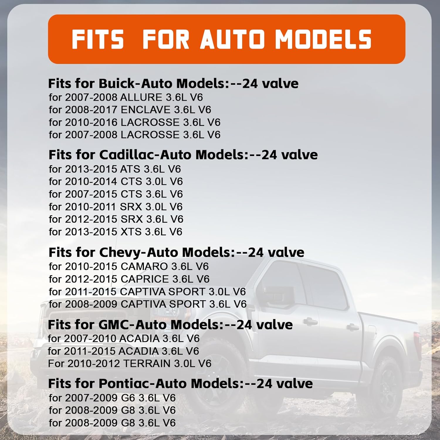 Specification; Part Number: 9-0753S, 12603745, 12626160, 12626161, 12630744, 12606653, 12614464, 12612838 Installation Details: Direct Replacement, Easy to install. Product Condition: New & High-Quality 🚙Fits for Buick-Auto Models: For Allure 2010 V6 3.0L For Allure 2010 V6 3.6L For Allure 2007-2008 V6 3.6L For Enclave 2008-2021 V6 3.6L For LaCrosse 2007-2008 V6 3.6L For LaCrosse 2010-2016 V6 3.6L 🚙Fits for Cadillac-Auto Models: For ATS 2013-2015 V6 3.6L For CTS 2010-2014 V6 3.0L For CTS 2007-2015 V6 3.6L For SRX 2010-2011 V6 2.8L Turbocharged For SRX 2010-2011 V6 3.0L For SRX 2007-2009 V6 3.6L For SRX 2012-2016 V6 3.6L For STS 2007-2011 V6 3.6L For XTS 2013-2019 V6 3.6L 🚙Fits for Chevy-Auto Models: For Camaro 2010-2015 V6 3.6L For Caprice 2012-2017 V6 3.6L For Captiva Sport 2014 L6 3.0L For Captiva Sport 2012-2015 V6 3.0L For Colorado 2015-2016 V6 3.6L For Equinox 2010-2012 V6 3.0L For Equinox 2008-2009 V6 3.6L For Equinox 2013-2017 V6 3.6L For Impala 2012-2020 V6 3.6L For Impala Limited 2014-2016 V6 3.6L For Malibu 2008-2012 V6 3.6L For Traverse 2009-2021 V6 3.6L 🚙Fits for GMC-Auto Models: For Acadia 2007-2016 V6 3.6L For Acadia Limited 2017 V6 3.6L For Canyon 2015-2016 V6 3.6L For Terrain 2010-2012 V6 3.0L For Terrain 2013-2017 V6 3.6L 🚙Fits for Pontiac-Auto Models: For G6 2007-2009 V6 3.6L For G8 2008-2009 V6 3.6L For Torrent 2008-2009 V6 3.6L 🚙Fits for Saturn-Auto Models: For Aura 2007-2009 V6 3.6L For Outlook 2007-2010 V6 3.6L For Vue 2008-2010 V6 3.6L Our Advantages: We have a professional technical team, provide high-quality products and excellent after-sales service.