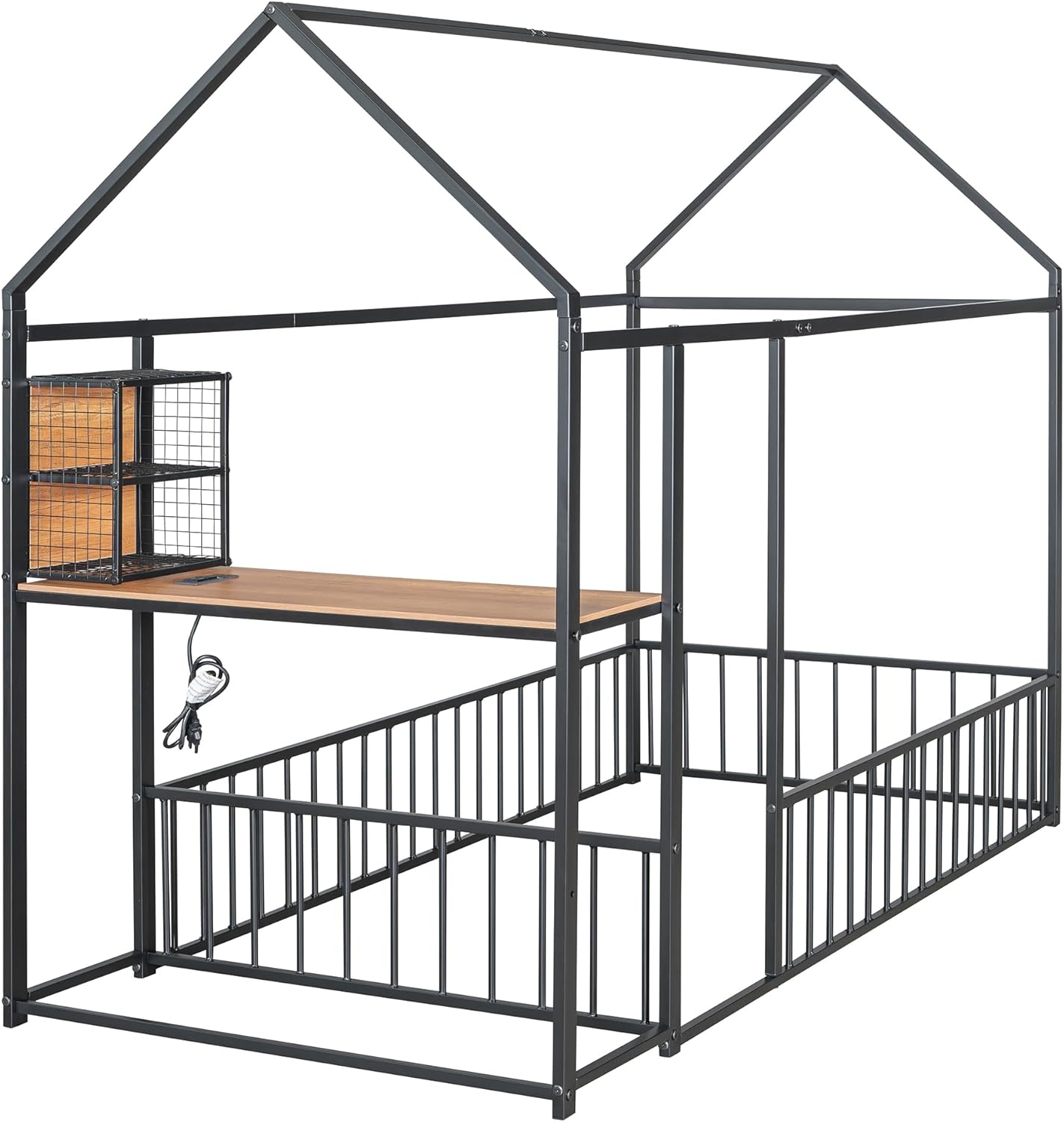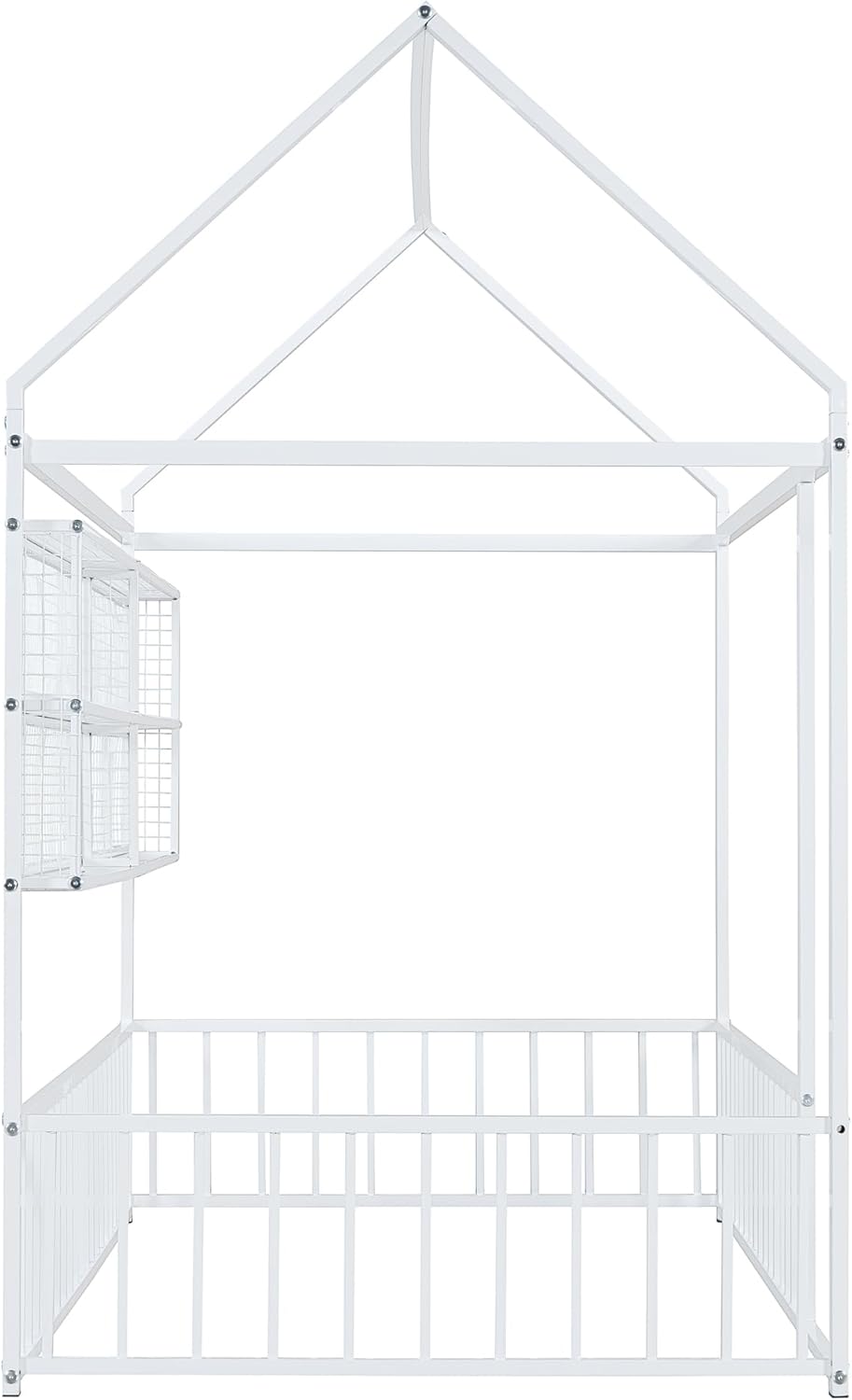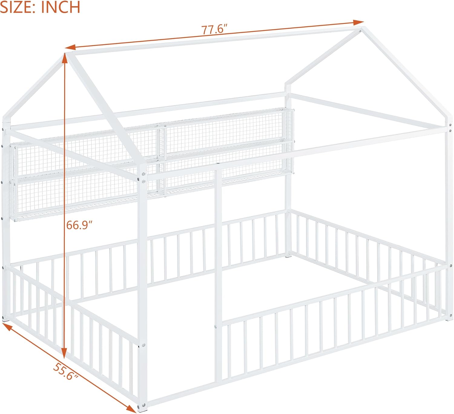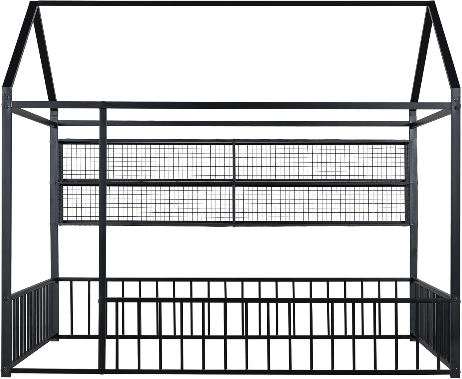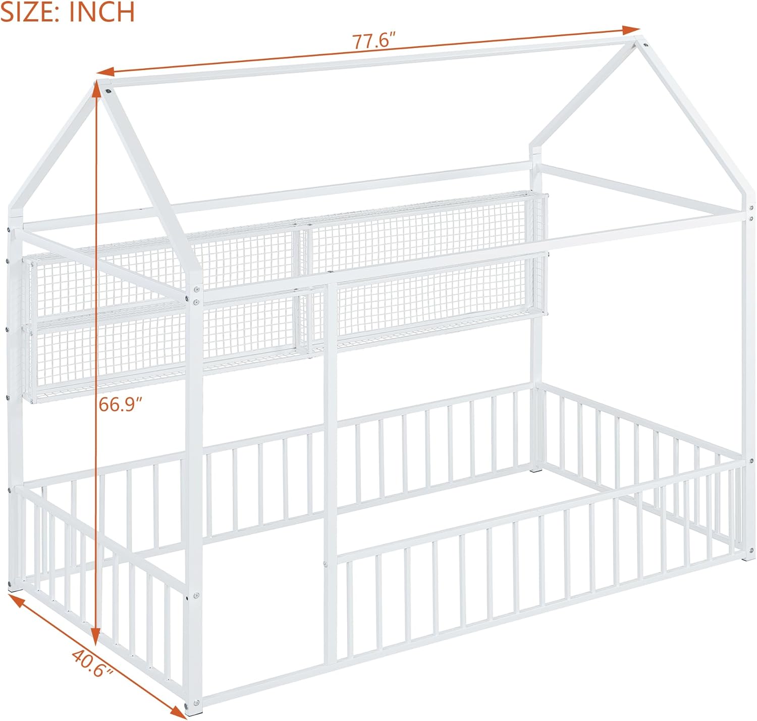 DescriptionFeaturing a roof and fence, this bed doubles as a semi-enclosed play place perfect for kids to study, watch TV, or explore their imaginations. With a fence and sturdy metal, this bed offers a safe space for your kids to get a good night's sleep. A choice of three colors, suitable for different decoration styles, if you are choosing a simple and elegant house bed, this will be the best choice.Weight & DimensionsOverall Product Dimension 91.3"L x 40.6"W x 67"HDetail Product Dimension Please refer to the Size imageNumber of Package 1Package Dimension Please refer to the SpecificationOverall Product Weight 60 LBSPackage Weight Please refer to the SpecificationWeight Capacity No limitRecommended age 6+Recommended Mattress Thickness 6-8"SpecificationsProduct Type House BedSize Twin/FullColor Black/WhiteMaterial MetalBox Spring Required NoNumber of Slats 0Assembly Required YesCountry of Origin Vietnam
