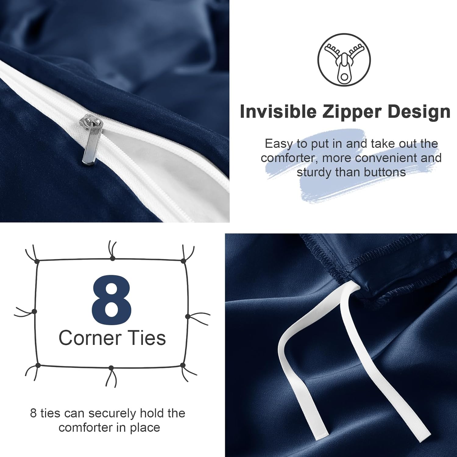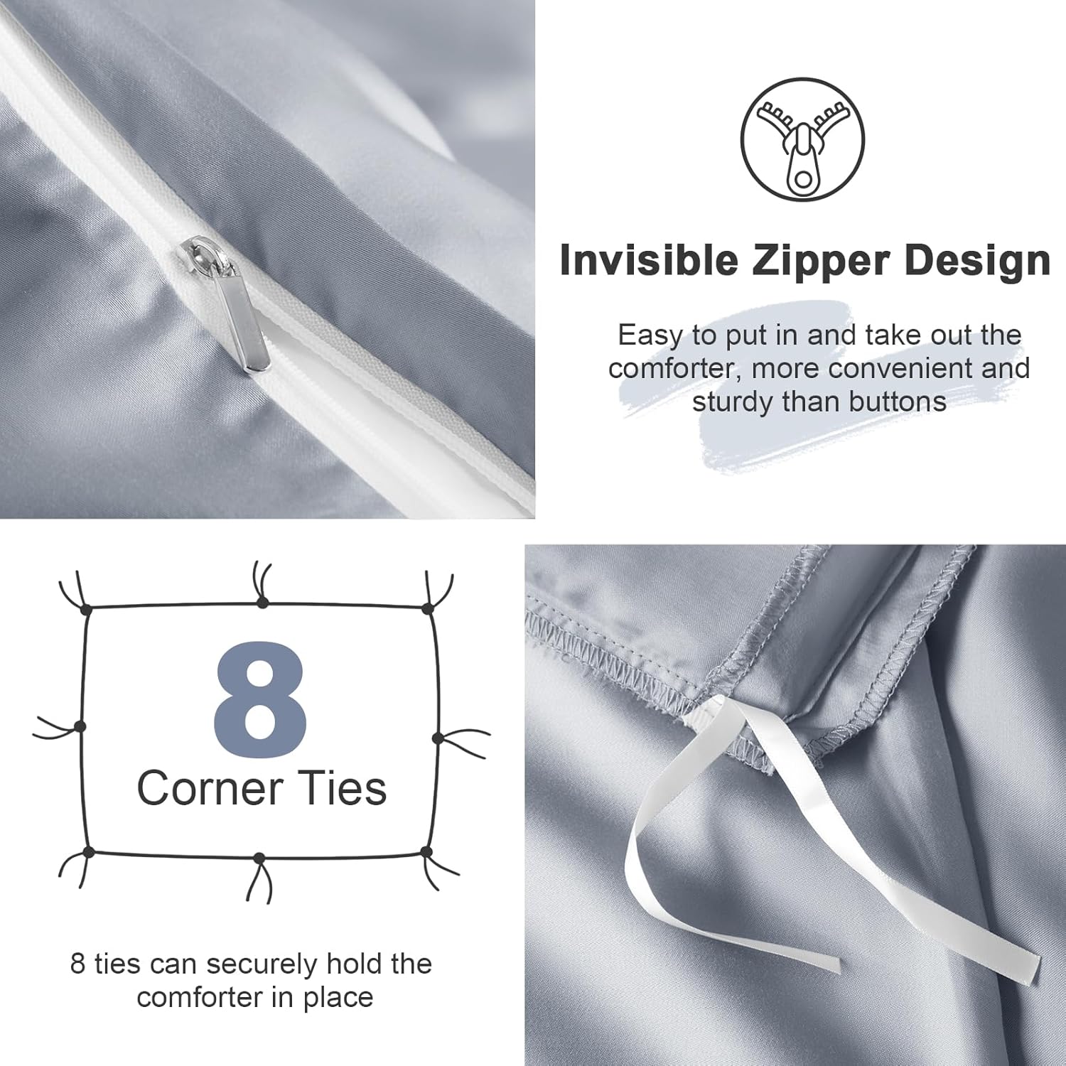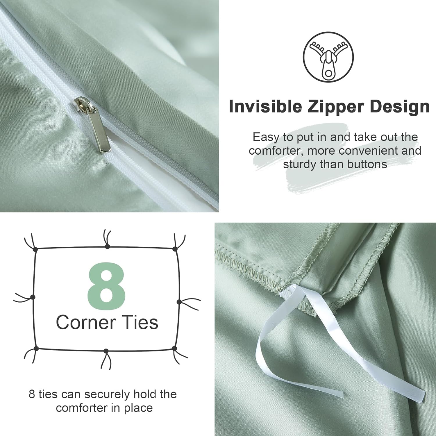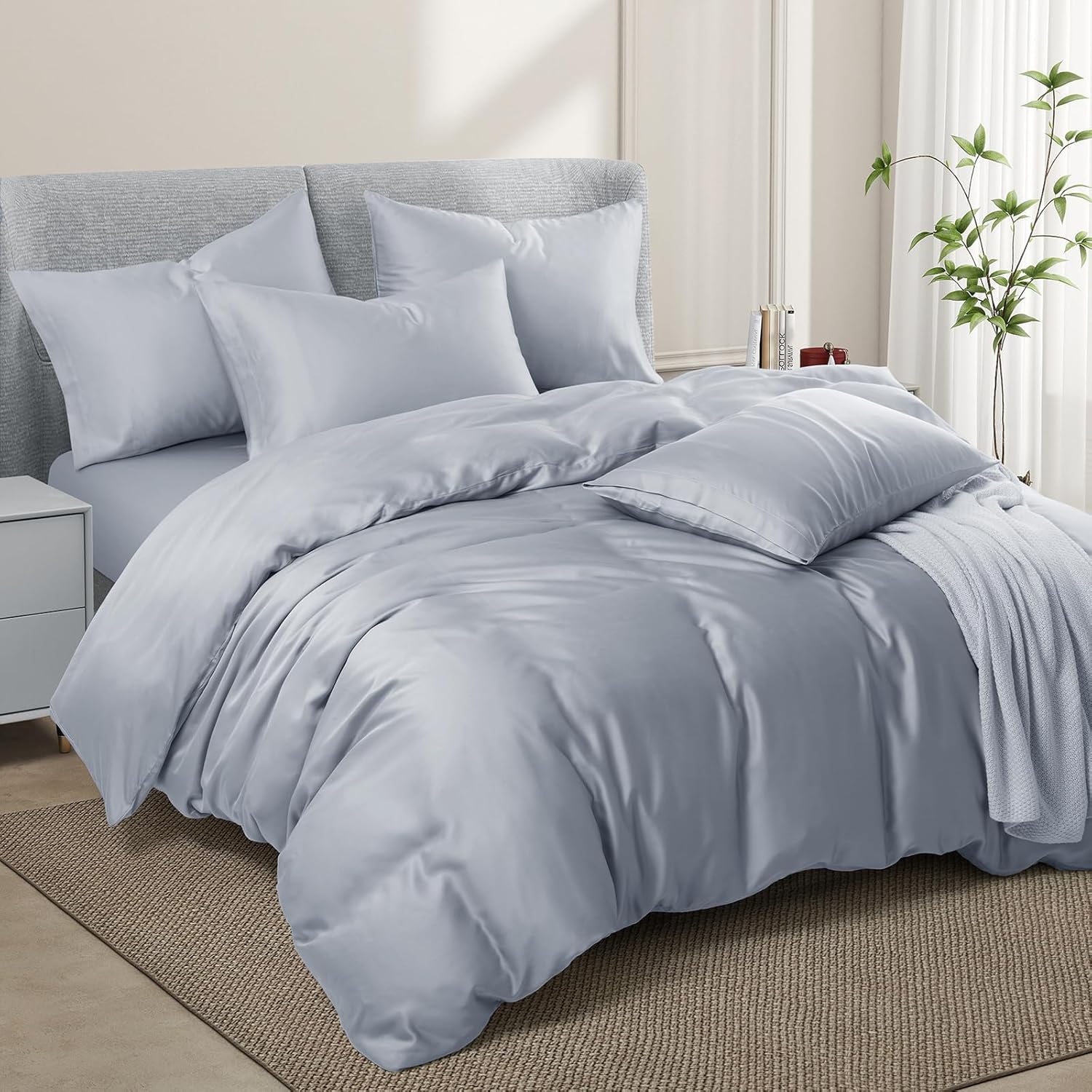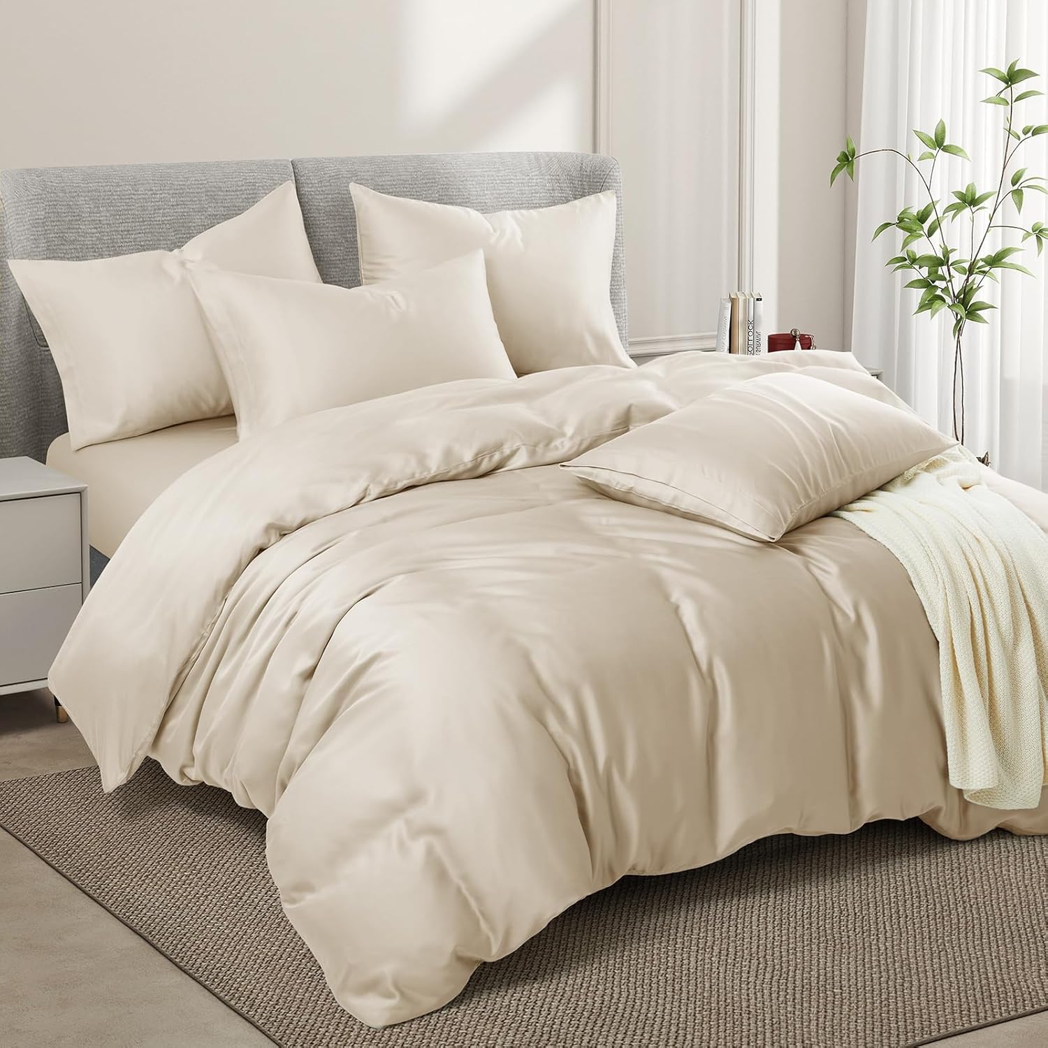 VACVELT 3PCS Cooling Duvet Cover Set --Luxurious duvet cover is made of 60% Tencel Lyocell + 40% Cotton, soft and breathable, warm in winter and cool in summer. --Cheap and cheerful, provide you with luxury experience and enjoy a quiet sleep. Available Color (Solid Color): White, Blush Pink, Sage Green, Lavender, Dark Grey, Light Grey, Mineral Blue, Navy Blue, Charcoal Black, Beige, Khaki, Burgundy Available Size: Full/Queen: 1 x Duvet Cover (90x90 Inch) 2 x Envelope Pillowcases (20x30 Inch) King: 1 x Duvet Cover (90x104 Inch) 2 x Envelope Pillowcases (20x40 Inch) Washing Suggestions: Machine wash in cold water at a gentle cycle is recommended, tumble dry low. In order not to damage bed set, please do not bleach. Tips: All the pictures of our products are taken in an environment with sufficient light. Because the satin fabric is glossy, the color will vary slightly under different light intensities. Please do not mind.