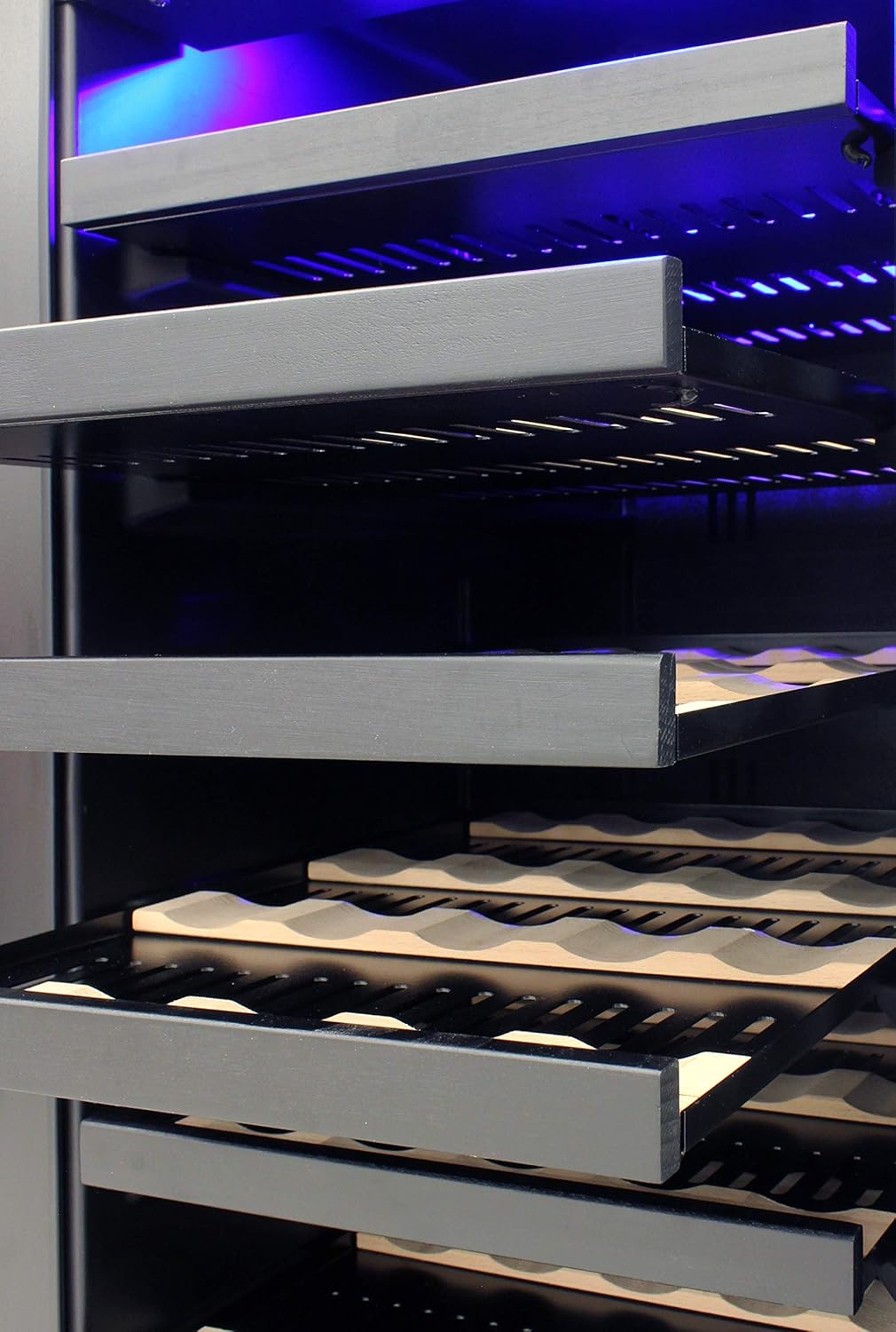 Vinotemp presents the ultimate wine and beverage cooler refrigerator designed for those who love to entertain and provide refreshing drinks. The Vinotemp Wine and Beverage Cooler Refrigerator comfortably stores up to 33 wine bottles and 101 cans, offering a total capacity of 113 bottles and cans. With two independent temperature zones, this unit can hold up to 33 standard (750 mL) wine bottles in the right compartment and 101 12 oz. cans on the left. The beverage compartment has 4 flat, adjustable glass shelving which allows for storing and/or stacking your favorite canned beverages. The wine compartment includes 6 Ouzo flat shelving with a black lip that have grooves to hold the bottles in place. A black cabinet with two seamless doors with dual-pane glass makes this unit an attractive addition to any kitchen or bar. Equipped with front exhaust compressor cooling technology, this wine & beverage cooler is designed to be built into existing cabinetry or to be used as a stand-alone unit. Modern soft blue interior LED lighting showcases your beverages making it easy to select each beverage. A built-in lock and key provides extra security from unwanted tampering. The Beverage fridge features Dynamic/Silent Mode, giving you the flexibility to adjust the noise levels to your preference. A temperature control panel with digital display is conveniently located at the top of each compartment making it simple to adjust the temperature for each zone. The Vinotemp Dual Zone Wine and Beverage Cooler is constructed to be larger in width to fit a 30 inch wide appliance.