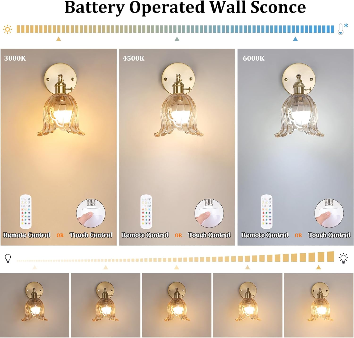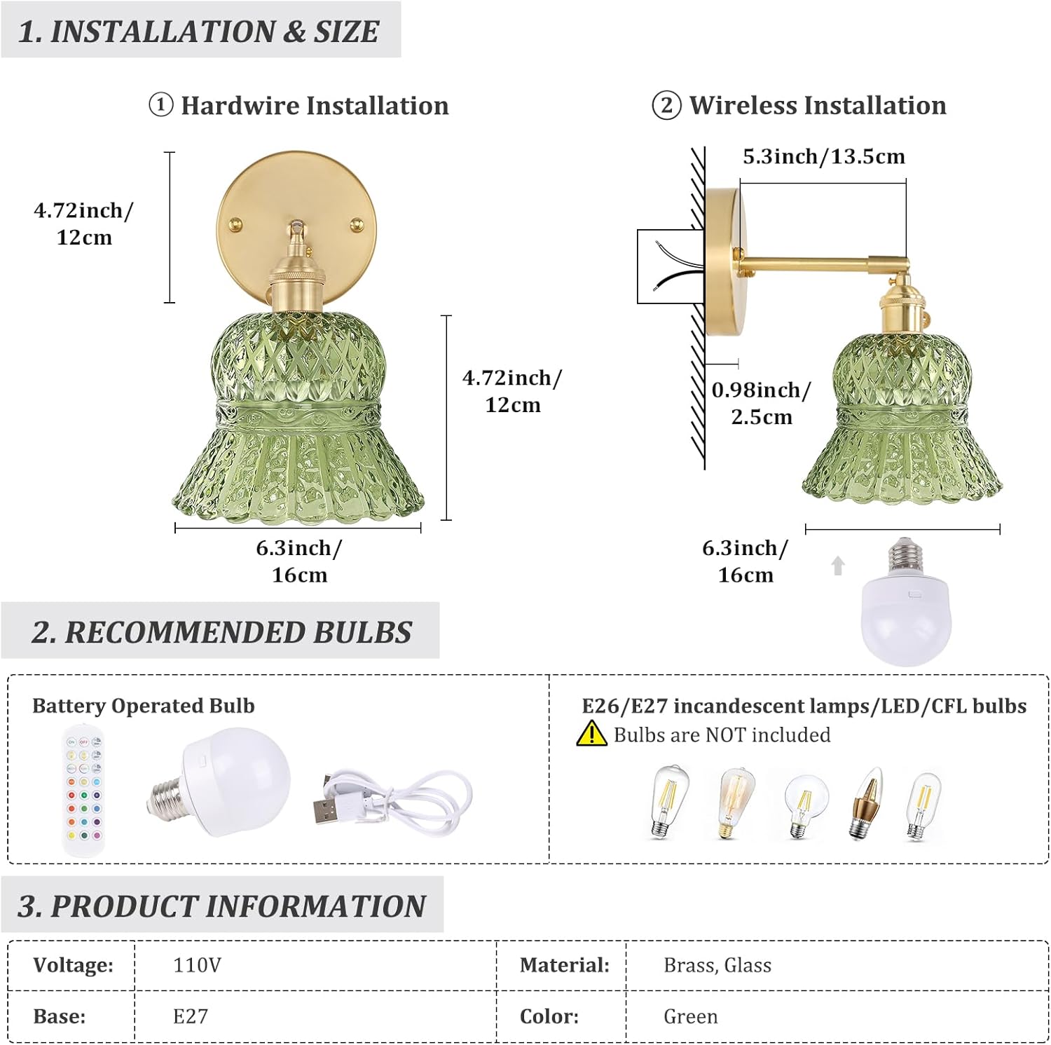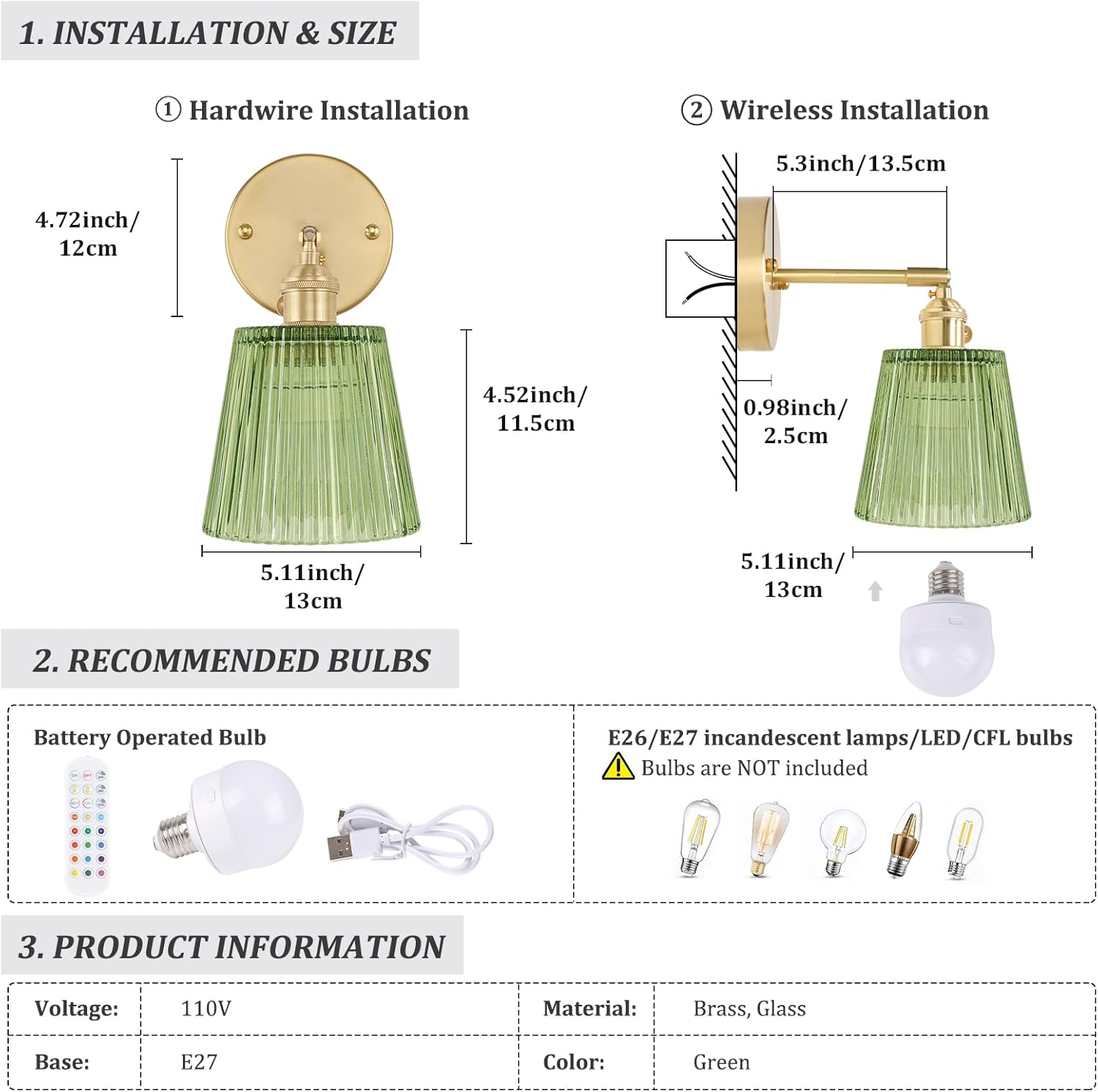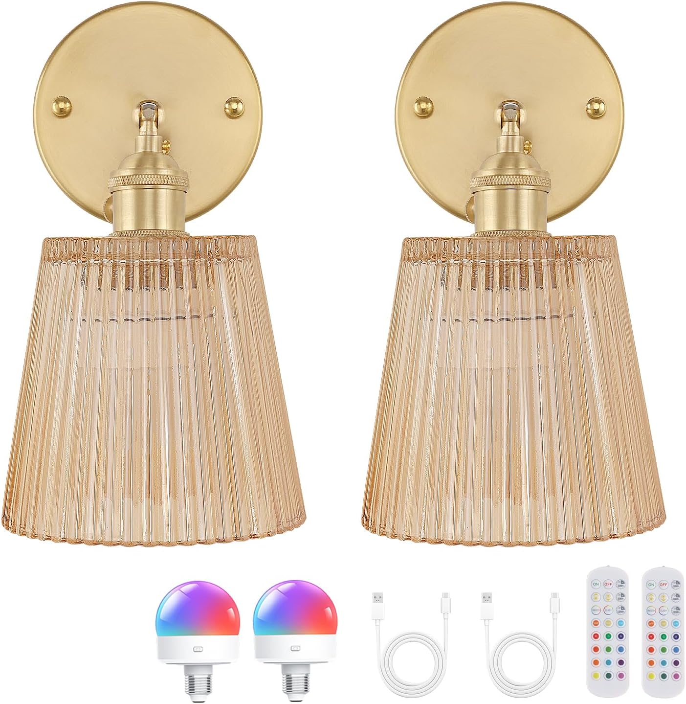 | Included Components | Glass Lampshades, RGB Battery Operated Bulbs, Remote Controls, Brass Bases, Brass Sockets, Mounting Hardware, Installation Instruction |
