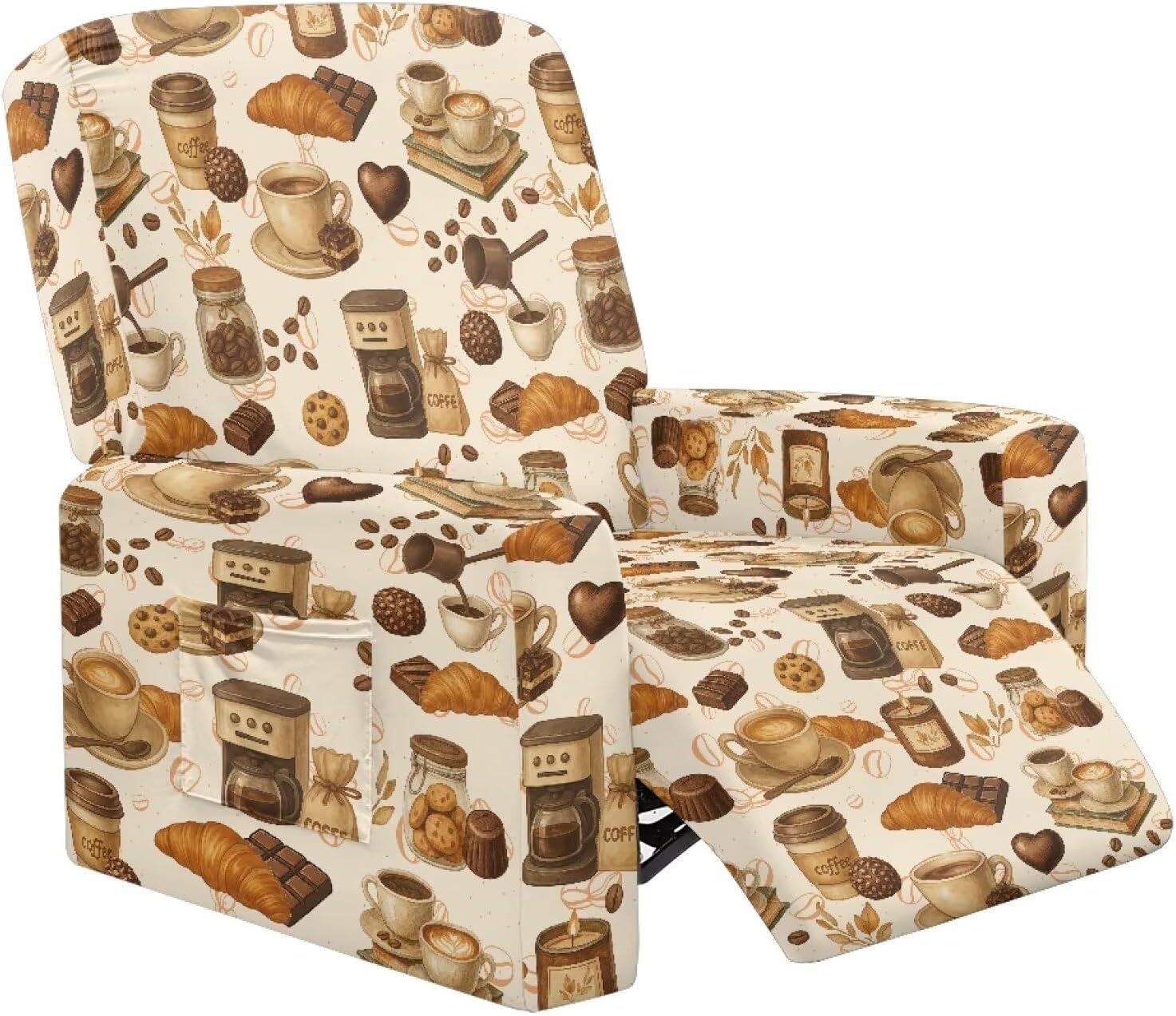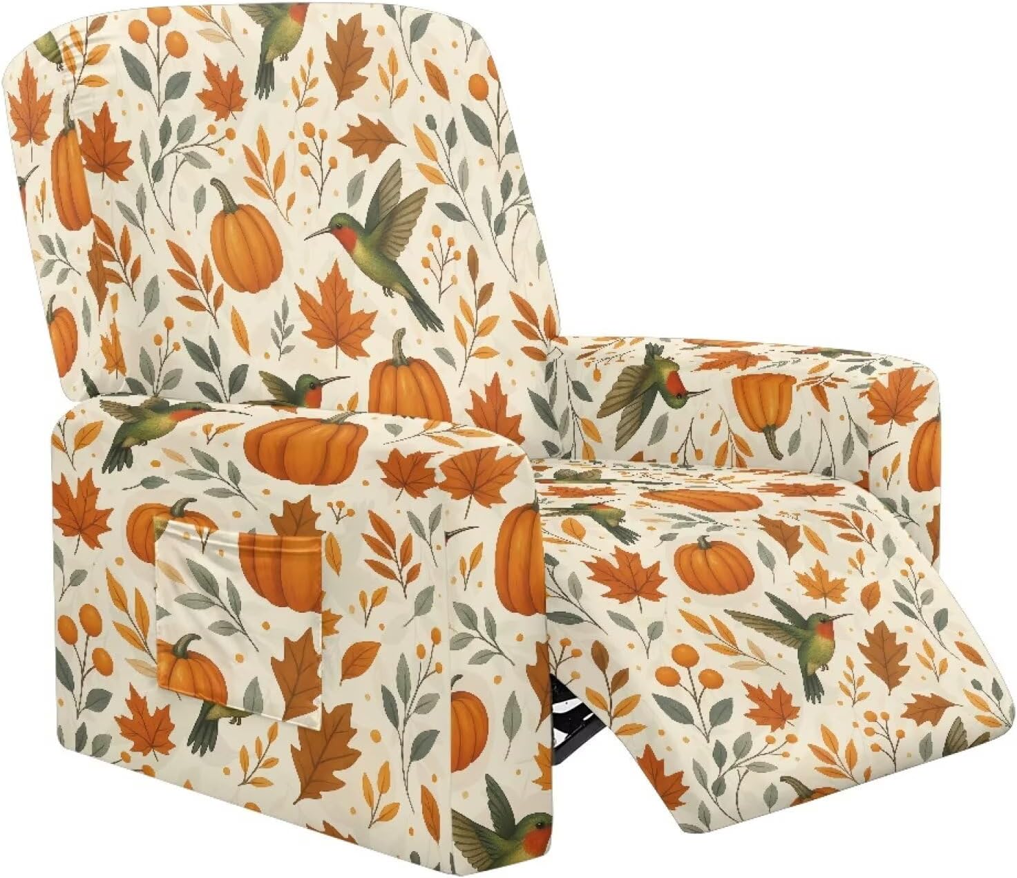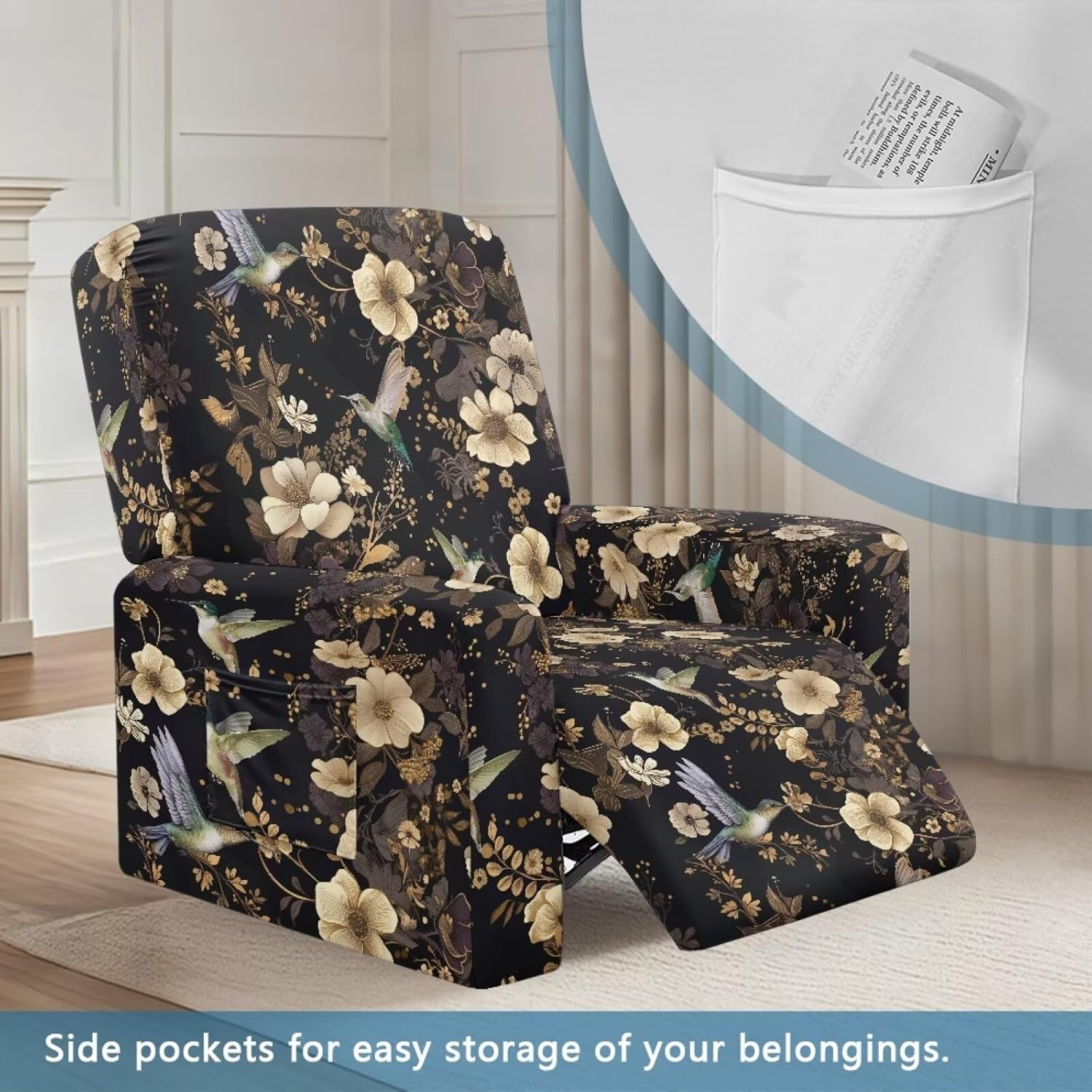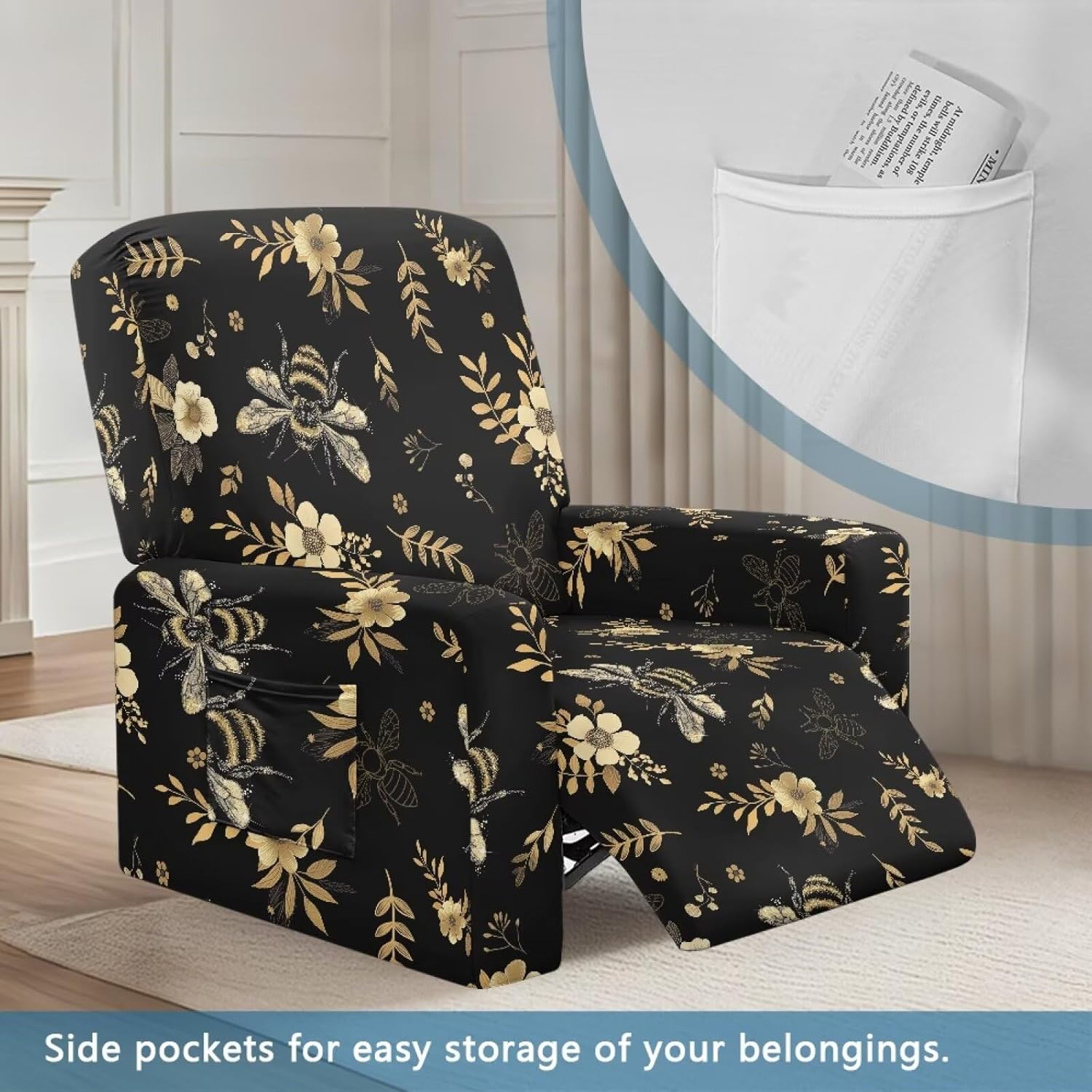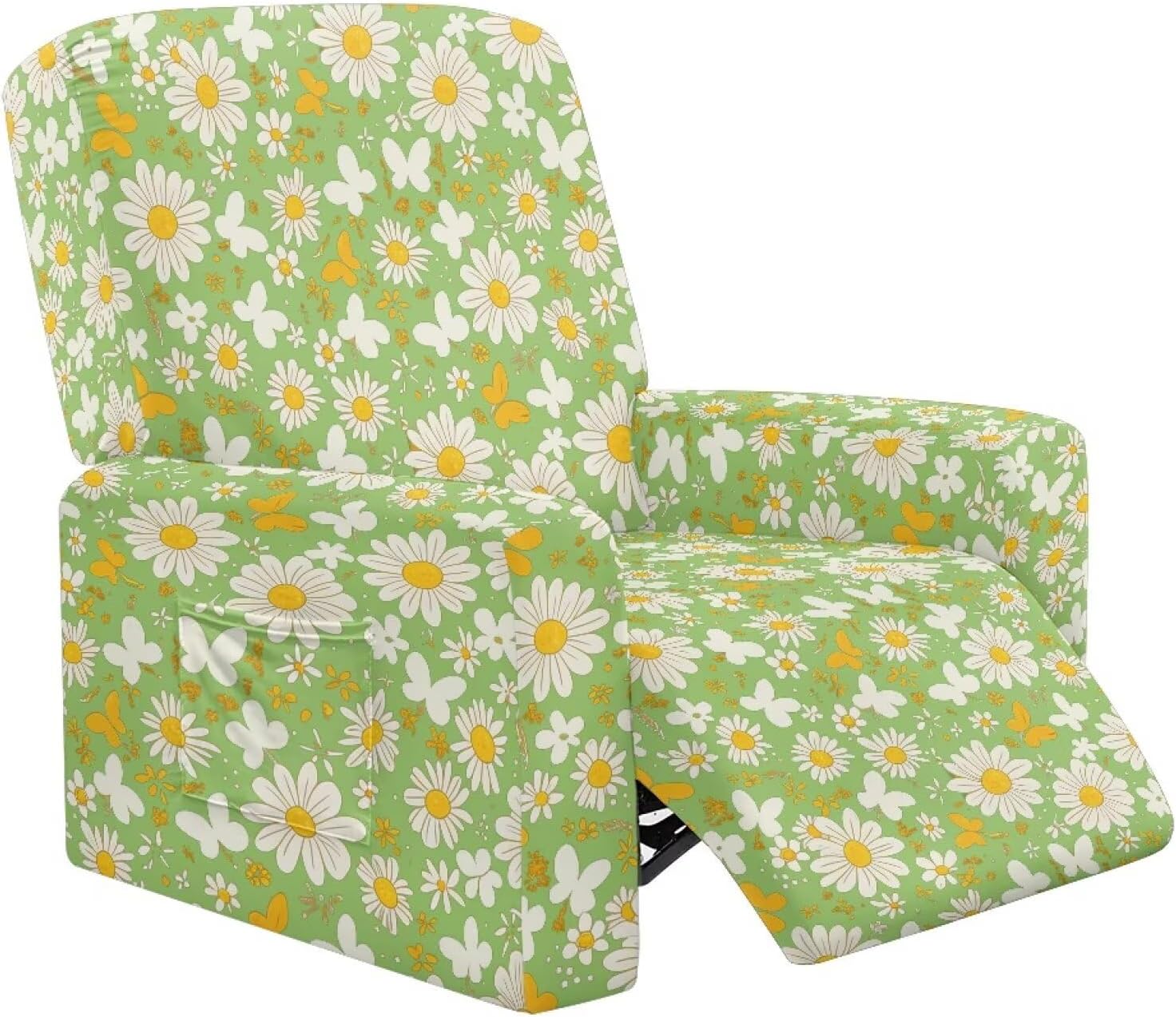 Transform and protect your recliner with our Premium Recliner Chair Cover, designed for comfort, style, and practicality. Made from a soft polyester and spandex blend, this highly elastic fabric ensures a snug fit while being wrinkle-resistant for long-term durability. Our covers are designed to fit most recliners, accommodating rest area widths of 23-35", backrests 27-37" wide and 17-22" high, and armrests 26-35" long and 20-29" high. Be sure to measure your recliner for a perfect fit. Not only do these covers provide complete protection from stains, pet scratches, and accidental spills, but they also revitalize old recliners and safeguard new ones. The elastic straps and reinforced bottom keep the cover securely in place, even with daily use. Plus, the large side pockets are perfect for storing remotes, glasses, books, and more to keep your space tidy. This 4-piece set includes a backrest cover, seat cover, and two armrest covers. Available in a variety of stylish prints, our reclining covers add a pop of color and elegance to any living room. Upgrade your recliner today with our functional and fashionable covers!