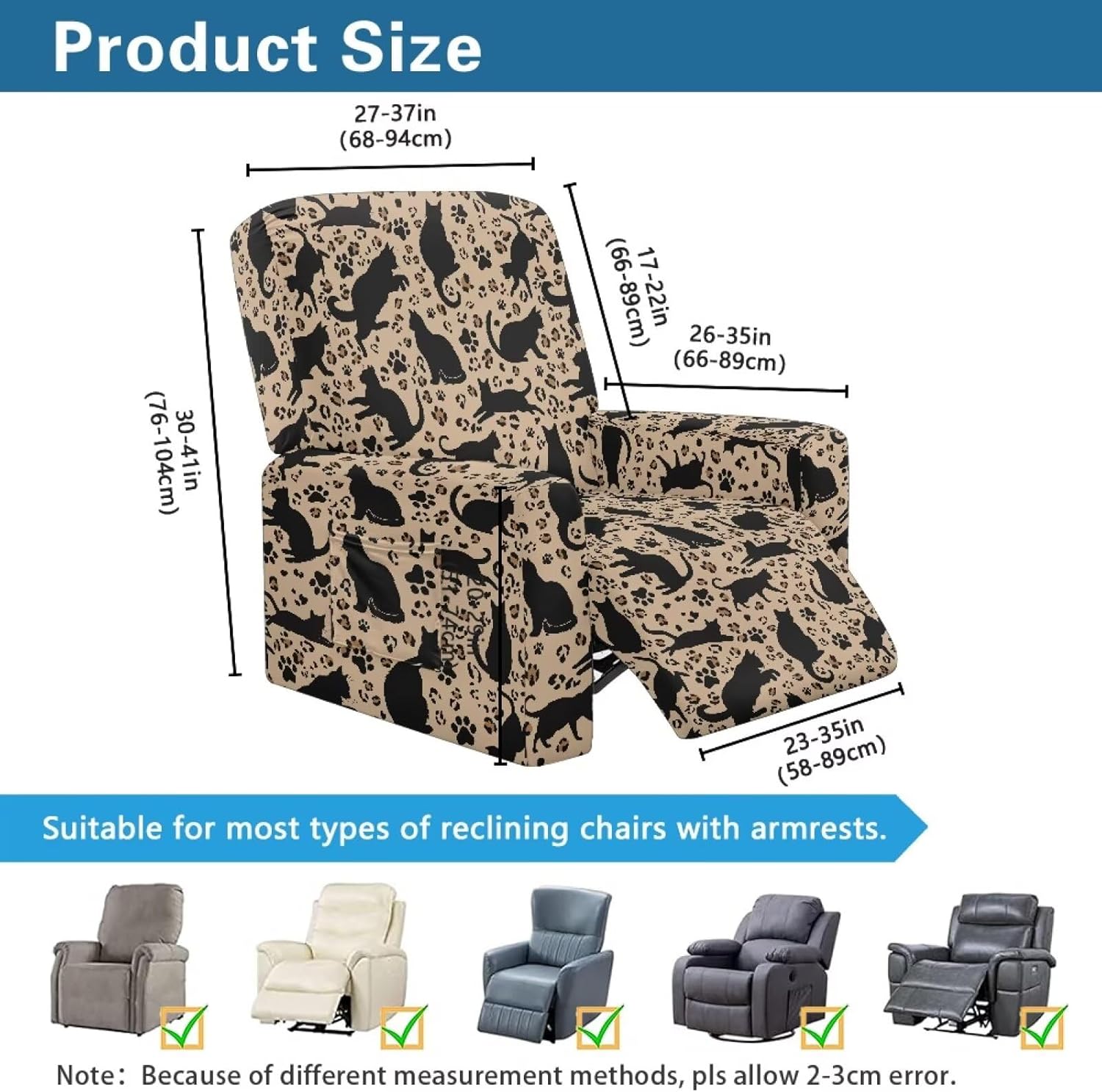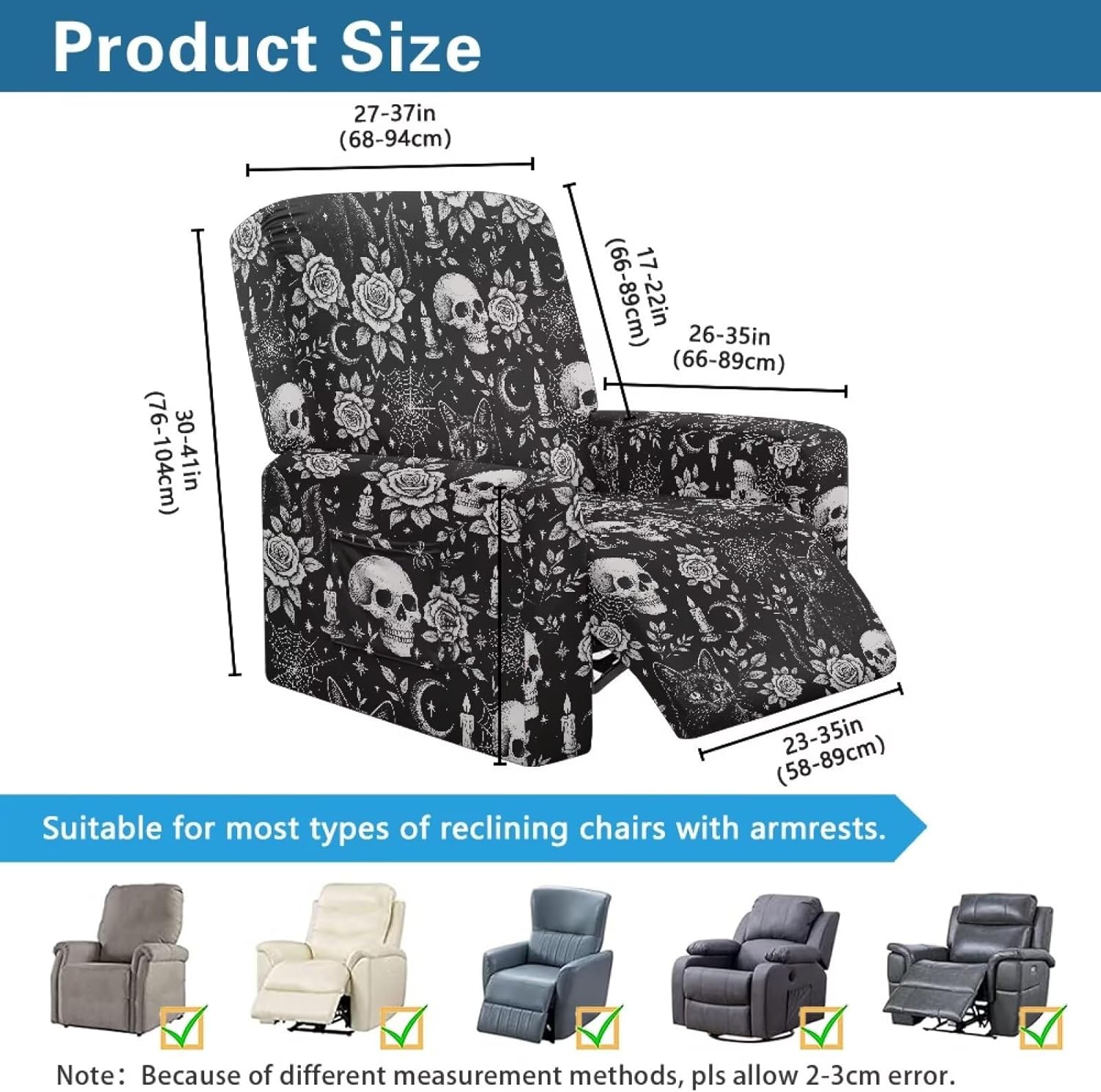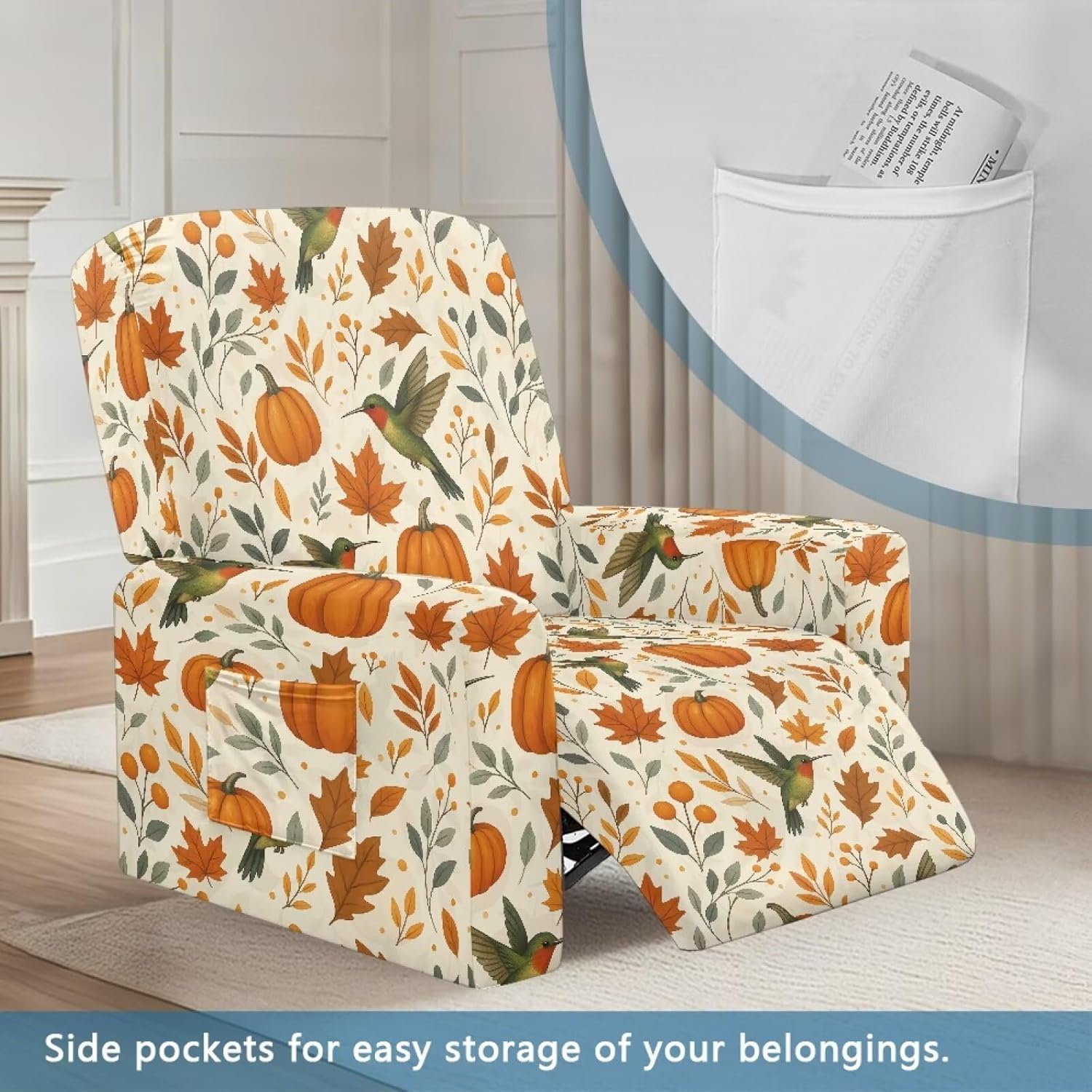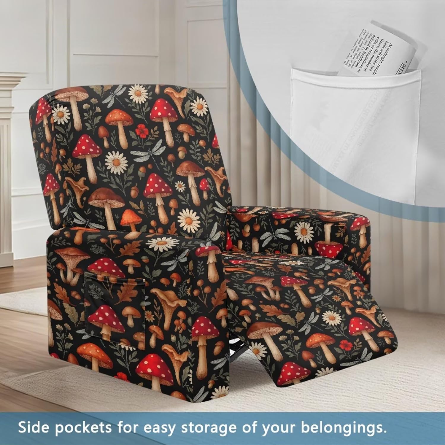 Transform and protect your recliner with our Premium Recliner Chair Cover, designed for comfort, style, and practicality. Made from a soft polyester and spandex blend, this highly elastic fabric ensures a snug fit while being wrinkle-resistant for long-term durability. Our covers are designed to fit most recliners, accommodating rest area widths of 23-35", backrests 27-37" wide and 17-22" high, and armrests 26-35" long and 20-29" high. Be sure to measure your recliner for a perfect fit. Not only do these covers provide complete protection from stains, pet scratches, and accidental spills, but they also revitalize old recliners and safeguard new ones. The elastic straps and reinforced bottom keep the cover securely in place, even with daily use. Plus, the large side pockets are perfect for storing remotes, glasses, books, and more to keep your space tidy. This 4-piece set includes a backrest cover, seat cover, and two armrest covers. Available in a variety of stylish prints, our reclining covers add a pop of color and elegance to any living room. Upgrade your recliner today with our functional and fashionable covers!