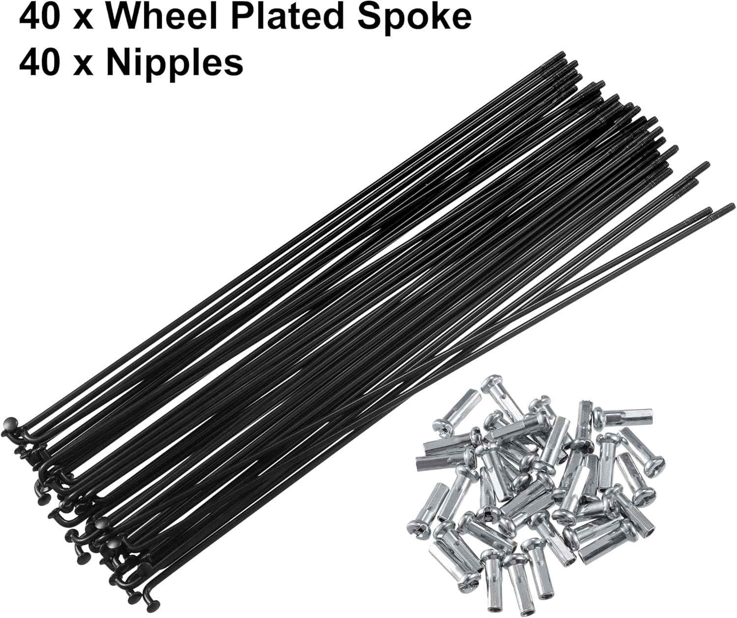 Description:Wheel spoke kit includes enough spokes and nipples to rebuild your bicycle wheel.Not only replace the spokes and nipples but upgrade them for race durability.The wheel uses a gradual continuous hammering technique that improves the oscillating load capacity.Spokes have good toughness and well anti-impact resistance, reducing the impact resistance of the wheel.Please allow a 3-5mm error!Specification: Color: BlackMaterial: MetalElbow Head Dia: 4mm / 0.16"Spokes Thread Dia: 2.2mm / 0.09"Spoke Shaft Diameter: 2mm/ 0.08''Nipples Size: 14 x 6mm / 0.55" x 0.24" (L*Max.D)Installation:According to the original arrangment of you wheel, so you can take a picture before installation.When installaing, the two adjacent spokes on the wheel drum are mounted in the first and third holes in the same direction on the rim (two spokes spaced one hole).Package Includes:40 x Wheel Plated Spoke40 x Nipples